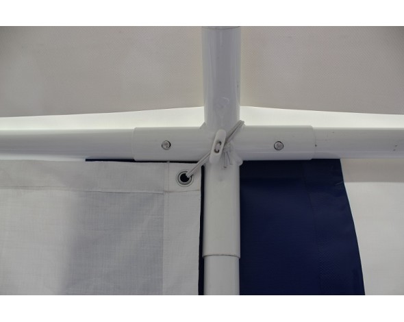 Каркас изготовлен из прочной стальной трубы Ø 40 х 1,2мм и усиленными узловыми соединениями (углами) из трубы Ø 40х1,5мм, покрыт порошковой краской. Каркас шатра имеет нижнее основание и верхнюю обвязку, которые повышают прочность конструкции. Соединение узлов каркаса осуществляется по системе безболтового крепления, для фиксации элементов каркаса между собой используются кнопки-защёлки (фиксаторы).