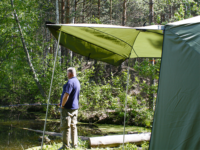 - За 30 секунд, путем открытия двух молний, одна сторона палатки поднимается и становится крышей. Палатка превращается в укрытие для летней рыбалки или просто шатром. Установив палатку на берегу водоема, Вы находитесь в укрытии и в то же время имеете открытый доступ к воде и абсолютно свободно работаете со снастями. В то же время вещи, прикормка, насадка, снасти - всё находится рядом в укрытии.
