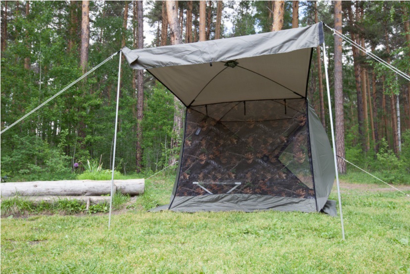 - За 30 секунд, путем открытия двух молний, одна сторона палатки поднимается и становится крышей. Палатка превращается в укрытие для летней рыбалки или просто шатром. Установив палатку на берегу водоема, Вы находитесь в укрытии и в то же время имеете открытый доступ к воде и абсолютно свободно работаете со снастями. В то же время вещи, прикормка, насадка, снасти - всё находится рядом в укрытии.