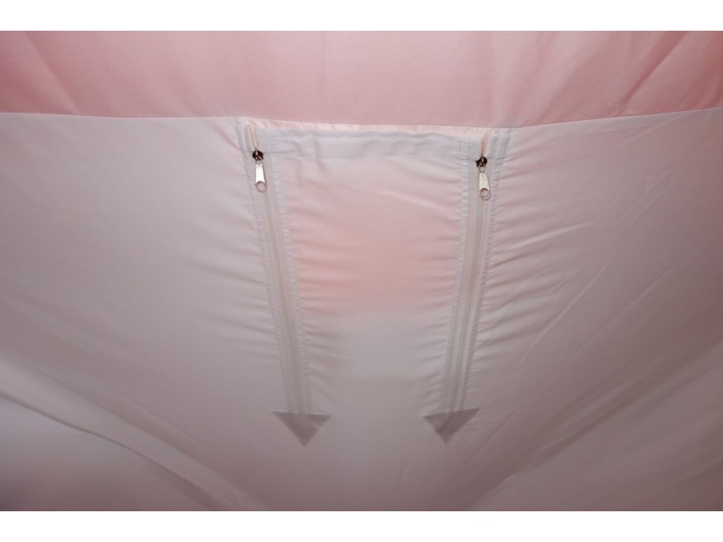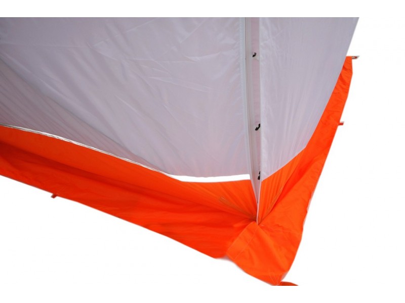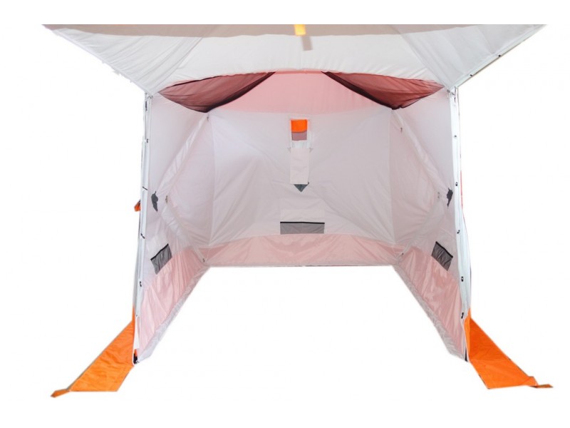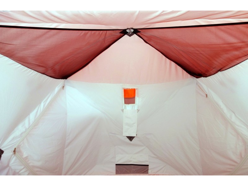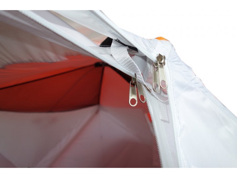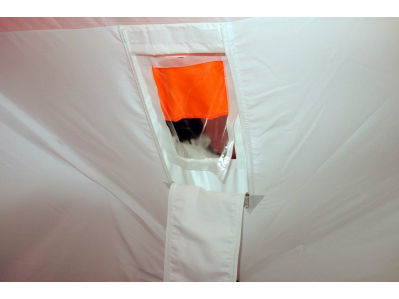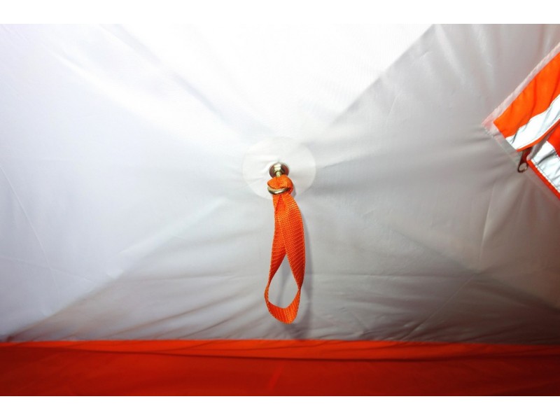 На наружной юбке имеются оттяжки для крепления порогов при отсутствии снега. На наружной юбке имеются оттяжки для крепления порогов при отсутствии снега. Внутренне пространство тоже стало намного удобнее. Сверху в тенте установлены 2 кармана-сетки для легких вещей, в дополнение к четырем сдвоенным карманам по периметру, 2 форточки, выполненных с применением прозрачной морозостойкой ПВХ-пленки (полностью съёмные). В наружном тенте имеется форточка, изготовленная с применением морозостойкой прозрачной ПВХ-пленки на контактной ленте (полностью съёмные). Внутренний тент полностью изготавливается из смесовой дышащей ткани СТ-1, что позволяет отводить из палатки излишнюю влагу и конденсат. Во внутреннем тенте имеется форточка на молнии и контактной ленте, три сдвоенных кармана с сеткой в нижней части тента и 2 потолочных кармана-сетки. Внутренний тент прикрепляется с помощью вязок и клевант к наружному тенту, таким образом, между тентами образуется воздушная прослойка, что является самым лучшим теплосберегающим элементом. Внутренний тент, в отличие от импортных аналогов, имеет белый цвет, что гораздо приятнее и практичнее, и в пасмурную погоду и ночью в палатке светло и комфортно, и требуется во много меньше освещения для ночной ловли.