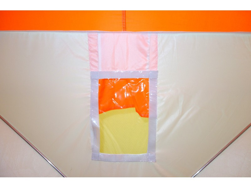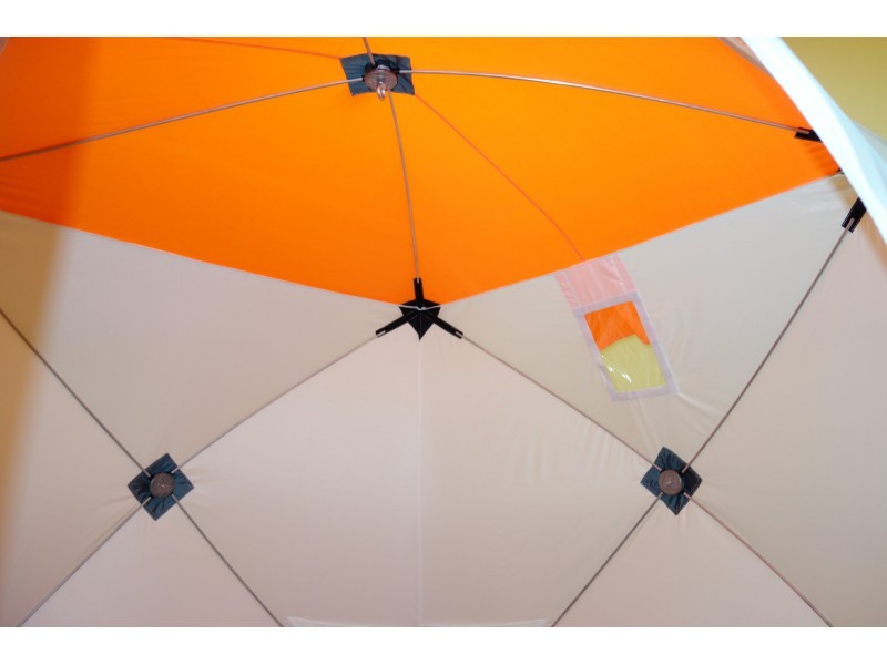 ✔Палатка выполнена в светлых тонах и имеет яркую крышу и пороги, а так же светоотражающие элементы по периметру, что позволяет увидеть палатку в ночное время. На наружной юбке имеются оттяжки для крепления порогов при отсутствии снега.