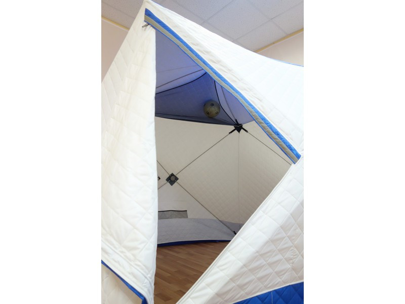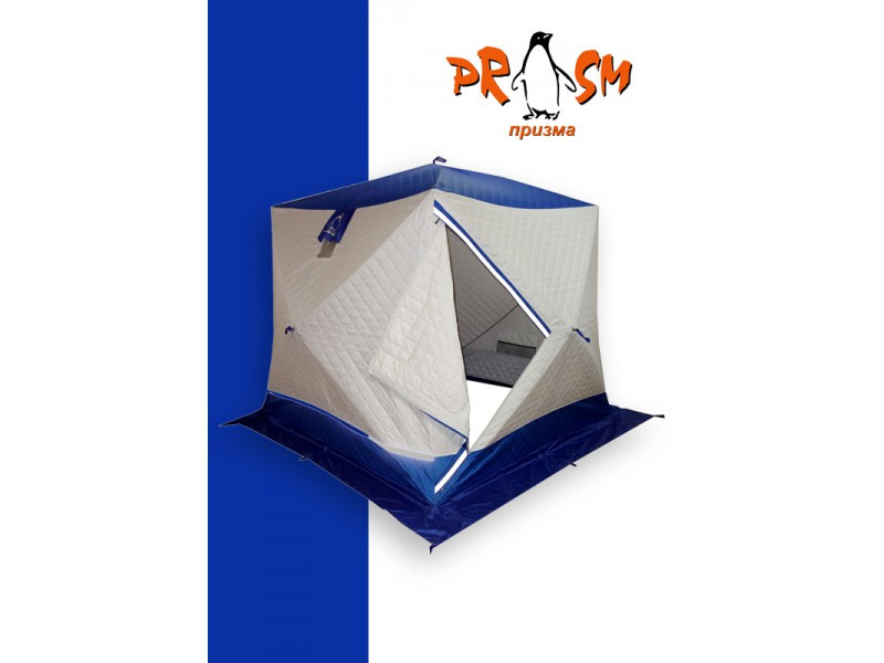 становленной палатке. Габариты ПРИЗМЫ позволяют делать это без каких-либо неудобств. В отличие от классических палаток ПИНГВИН, палатка ПРИЗМА более ветроустойчива. Благодаря своей конструкции палатка выдерживает порывистый ветер. Легко ставится одним человеком в любую погоду. Новая трехслойная ткань ТЕРМОЛАЙТ позволяет комфортно рыбачить в любую непогоду. ПРИЗМА ПРЕМИУМ имеет увеличенные размеры. Теперь в ней могут свободно разместиться четыре человека и комфортно рыбачить как днем, так и ночью! Для удобства сделано два входа. Входы сделаны не по диагонали, как принято на всех импортных аналогах, а напротив друг друга, что позволило оптимизировать внутреннее пространство. Входы выполнены в угловом варианте и снабжены застежкой липучкой. Так же входы снабжены специальной зимней молнией, которая снаружи имеет защитную планку, предотвращающую от замерзания. Палатка выполнена в светлых тонах и имеет яркую крышу и пороги, а так же светоотражающие элементы по периметру, что позволяет увидеть палатку в ночное время.На наружной юбке имеются оттяжки для крепления порогов при отсутствии снега. Внутренне пространство тоже стало намного удобнее. Сверху в тенте Призма Премиум Термолайт установлены 2 кармана-сетки для легких вещей, в дополнение к четырем сдвоенным карманам по периметру, 2 форточки, выполненных с применением прозрачной морозостойкой ПВХ-пленки (полностью съёмные).