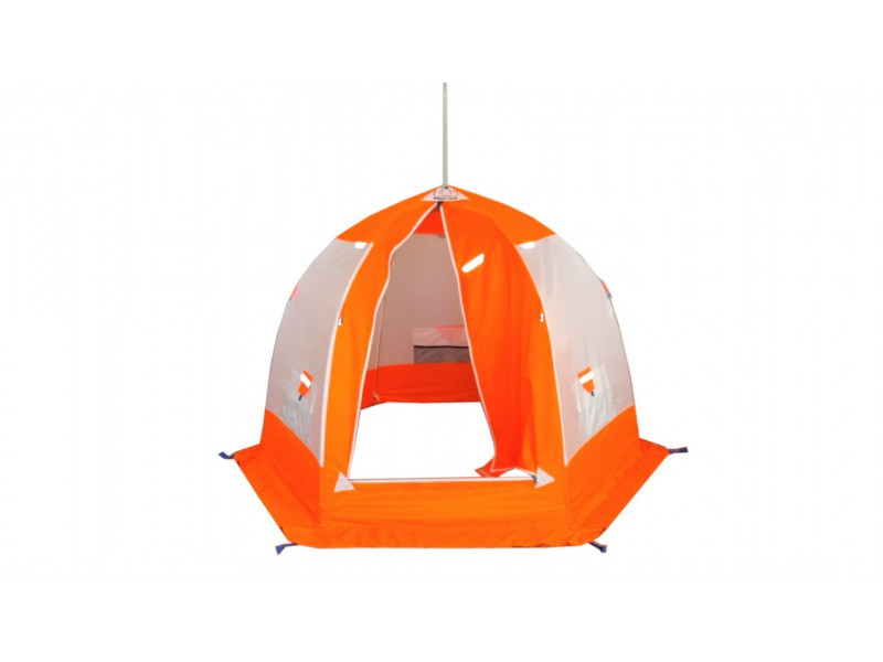 Эта модель часто используется и летом, позволяя укрыться от непогоды или использовать в хозяйственных целях. Основной цвет белый с цветной крышей, порогами и дверью, снаружи имеются светоотражающие элементы, что очень важно для безопасности на льду в темное время суток.