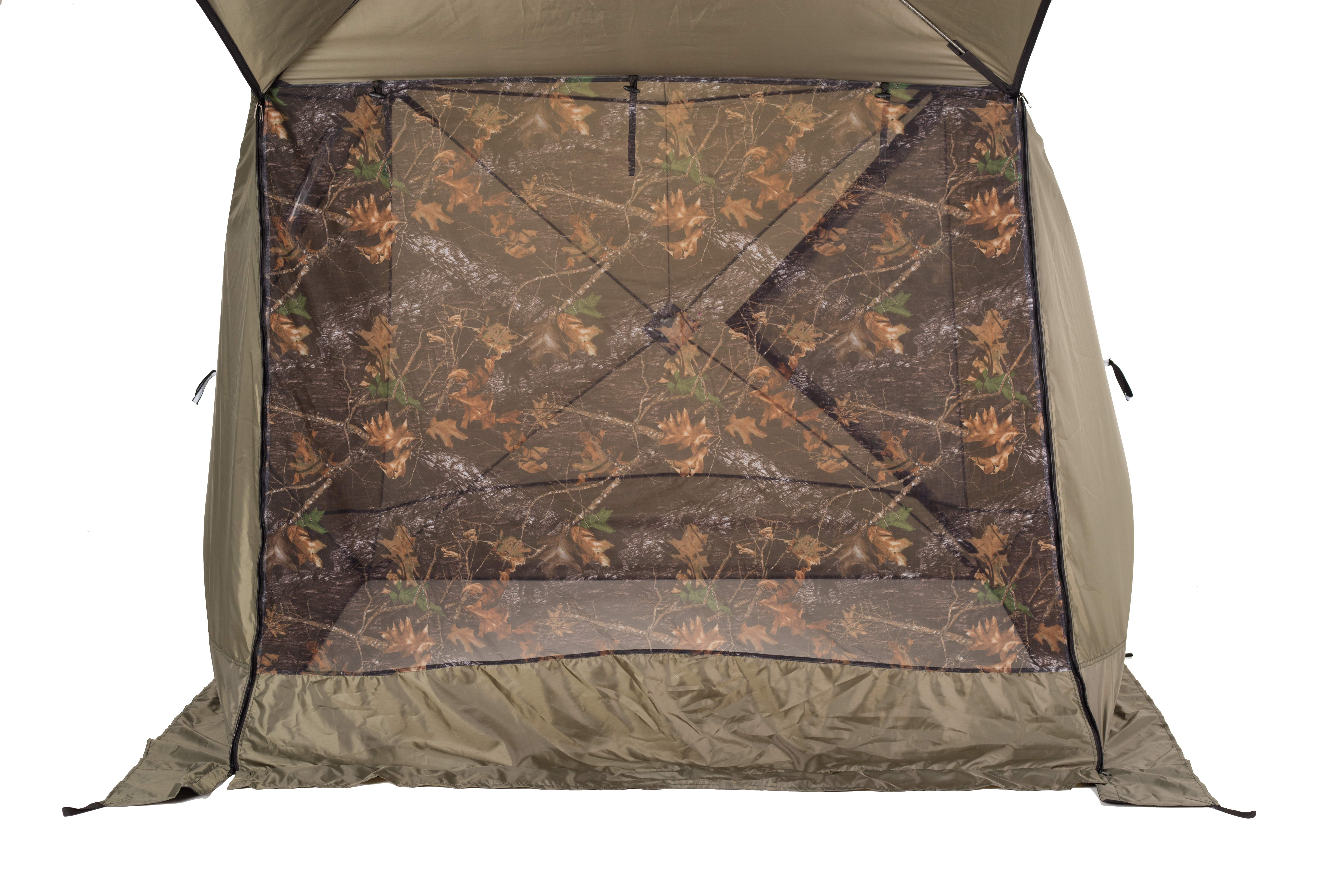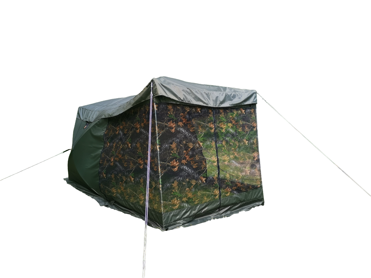 - За 30 секунд, путем открытия двух молний, одна сторона палатки поднимается и становится крышей. Палатка превращается в укрытие для летней рыбалки или просто шатром. Установив палатку на берегу водоема, Вы находитесь в укрытии и в то же время имеете открытый доступ к воде и абсолютно свободно работаете со снастями. В то же время вещи, прикормка, насадка, снасти - всё находится рядом в укрытии.