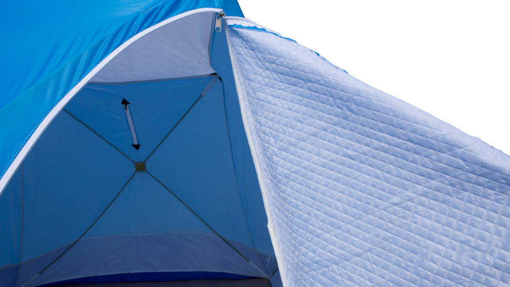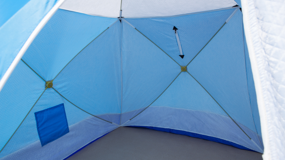 Прочный каркас палатки выполнен из фибергласса (стеклопластик) с добавлением карбона. Этот материал хорошо амортизирует и поэтому не боится ветровых нагрузок. Также он имеет минимальный вес (в сравнении с дюралевыми каркасами), что очень удобно при ходовой рыбалке, когда палатку приходится переносить на себе. Тент изготовлен из синтетической непродуваемой ткани (оксфорд 240PU). Внутренний тент стеганое полотно из синтепона и подкладочной ткани таффета (термостëжка). Оксфорд и термостёжка не склеены и не стеганы между собой, что позволяет создавать пространство для создания воздушно - тепловой подушки. Так же это позволяет удалять образующий конденсат и просушивать палатку. Снаружи расположена сплошная ветрозащатная юбка.