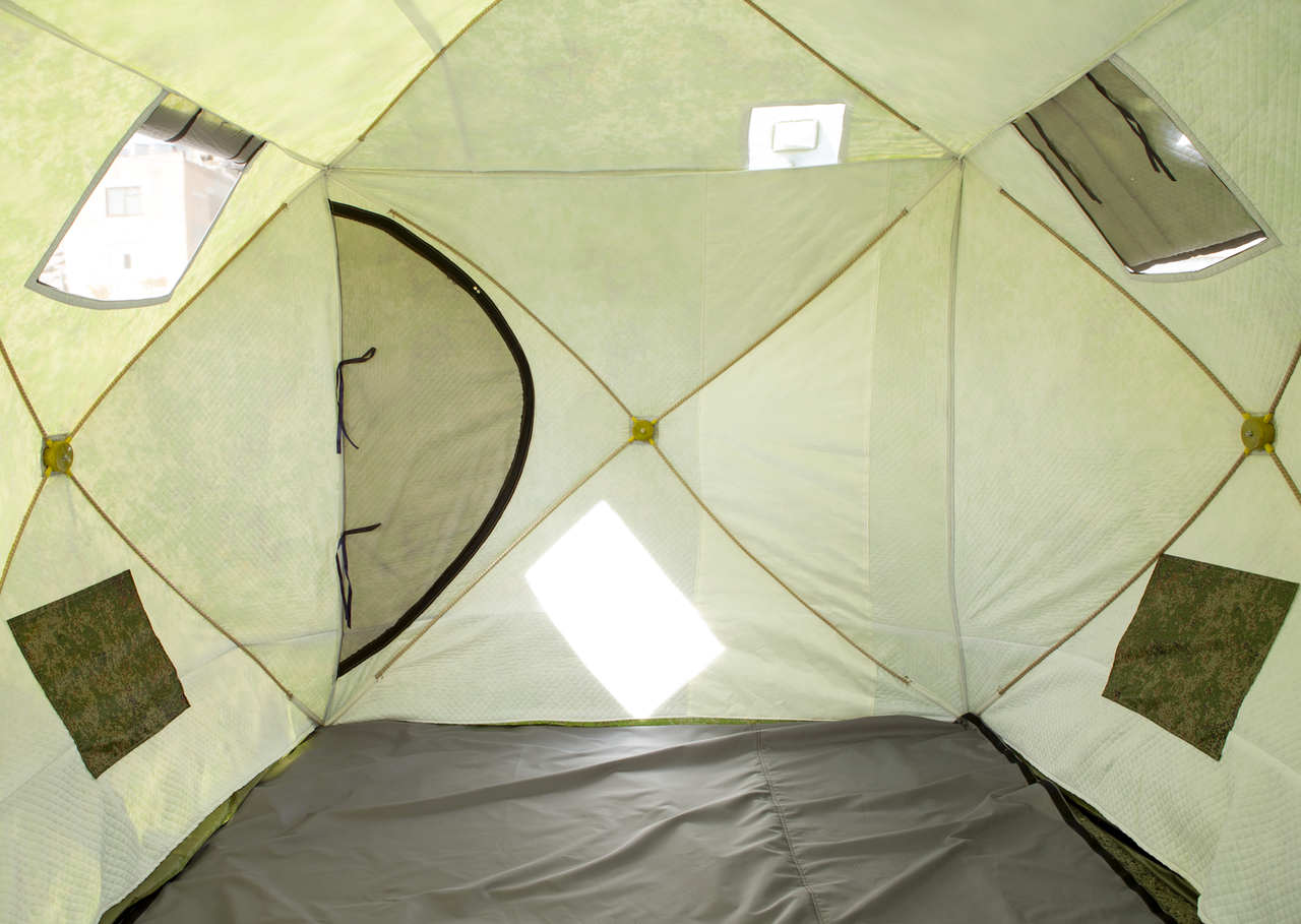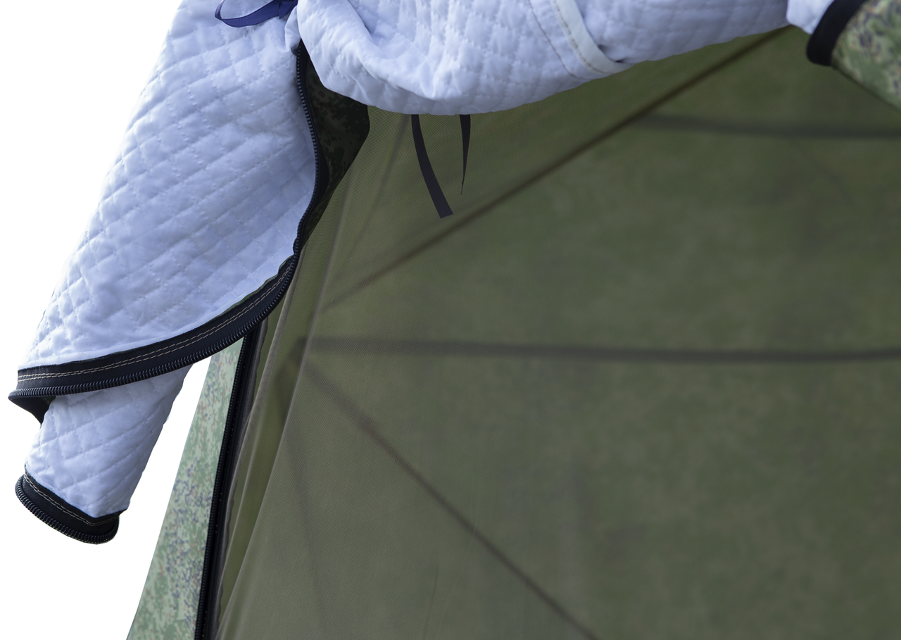 Внутренний тент стеганое полотно из синтепона и подкладочной ткани таффета (термостëжка). Оксфорд и термостёжка не склеены и не стеганы между собой, что позволяет создавать пространство для создания воздушно - тепловой подушки. Так же это позволяет удалять образующий конденсат и просушивать палатку. Снаружи расположена сплошная ветрозащатная юбка.