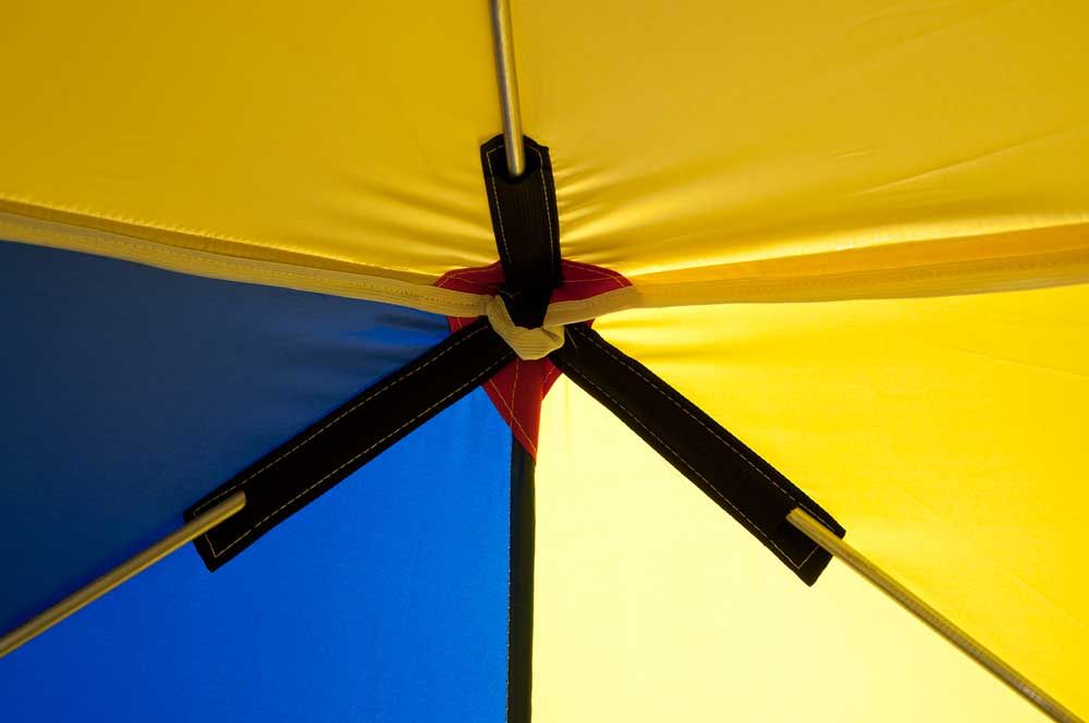 Закрытие палатки. Сначала закрываем все четыре стороны палатки (слегка надавливая на петлю вовнутрь палатки), затем последней закрываем крышу.