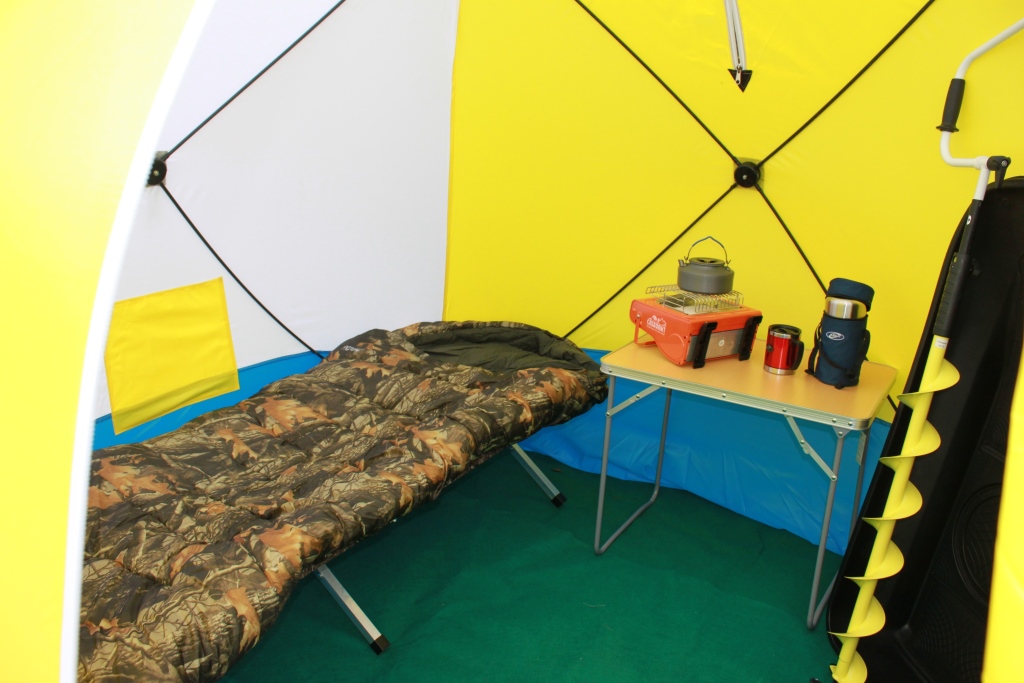 Прочный каркас палатки выполнен из фибергласса (стеклопластик) с добавлением карбона. Этот материал хорошо амортизирует и поэтому не боится ветровых нагрузок. Также он имеет минимальный вес (в сравнении с дюралевыми каркасами), что очень удобно при ходовой рыбалке, когда палатку приходится переносить на себе. Прочная водостойкая непродуваемая ткань тента (оксфорд 300PU) надежно защитит от ветра и атмосферных осадков, 50 см верха палатки - вставка из дышащей ткани (типа брезент). Нижний тент стеганое полотно из синтепона и подкладочной ткани таффета (термостежка). Ткань таффета обладает водо- и грязеотталкивающими свойствами. Устойчива к истиранию и механическим воздействиям. Тент палатки выполнен из ткани, которая позволяет пропускать дневной свет во внутрь палатки, благодаря чему рыболов имеет возможность ловить рыбу в дневное время без подсветки дополнительными осветительными приборами. Вентиляционное окно закрывается на молнию. Снаружи расположена сплошная ветрозащатная юбка.