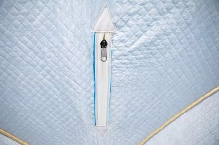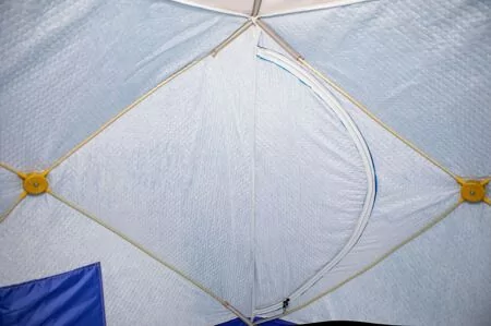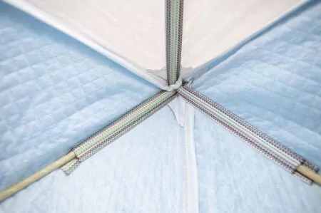Прочный каркас палатки выполнен из фибергласса (стеклопластик) с добавлением карбона. Этот материал хорошо амортизирует и поэтому не боится ветровых нагрузок. Также он имеет минимальный вес (в сравнении с дюралевыми каркасами), что очень удобно при ходовой рыбалке, когда палатку приходится переносить на себе. Прочная водостойкая непродуваемая ткань тента (оксфорд 240 2000PU) надежно защитит от ветра и атмосферных осадков, 50 см верха палатки - вставка из дышащей ткани (типа брезент). Нижний тент стеганое полотно из синтепона и подкладочной ткани таффета (термостежка). Ткань таффета обладает водо- и грязеотталкивающими свойствами. Устойчива к истиранию и механическим воздействиям. Тент палатки выполнен из ткани, которая позволяет пропускать дневной свет во внутрь палатки, благодаря чему рыболов имеет возможность ловить рыбу в дневное время без подсветки дополнительными осветительными приборами. Вентиляционное окно закрывается на молнию. Снаружи расположена сплошная ветрозащатная юбка.