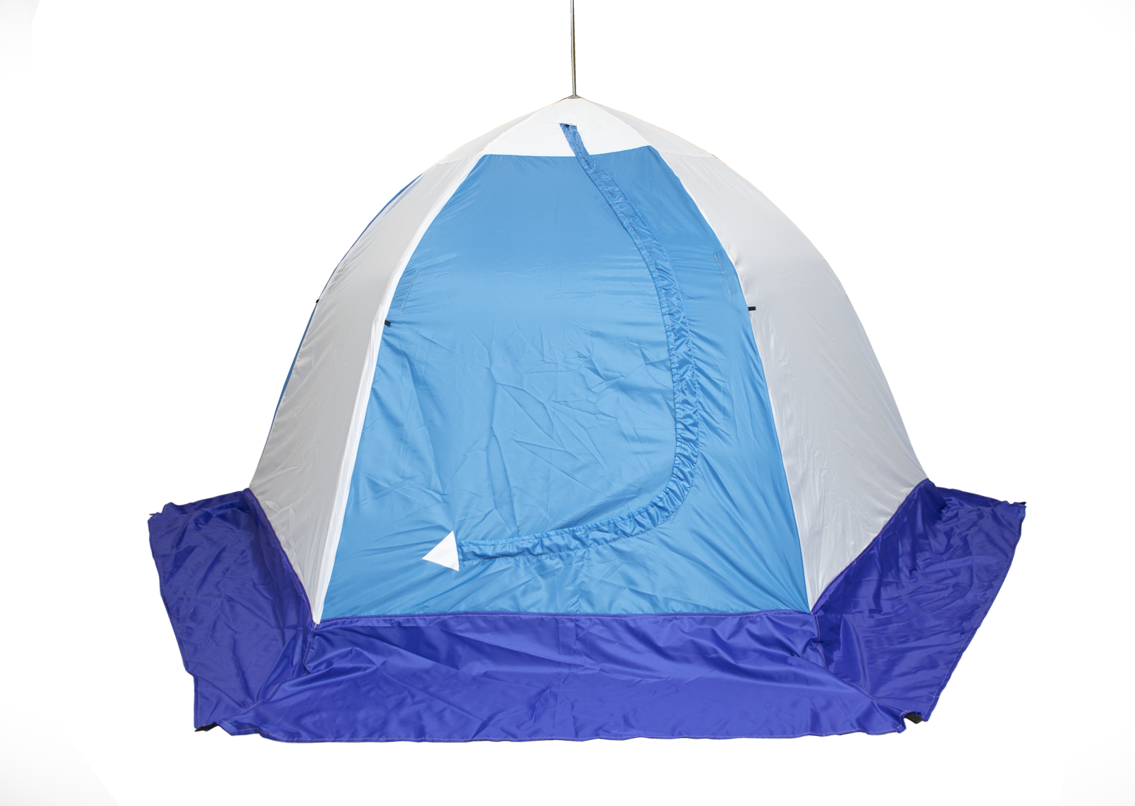 Основная часть тента изготовлена из синтетической водостойкой ткани 210 Neylon Oxford. У моделе рыболовных палаток с индексом "Д" (дышащие) верхняя часть тента выполнена из брезента. Такие палатки имеют преимущество в мороз - они лучше дышат и меньше обмерзают. Крепление зимней палатки ко льду производится растяжками от дуг каркаса.