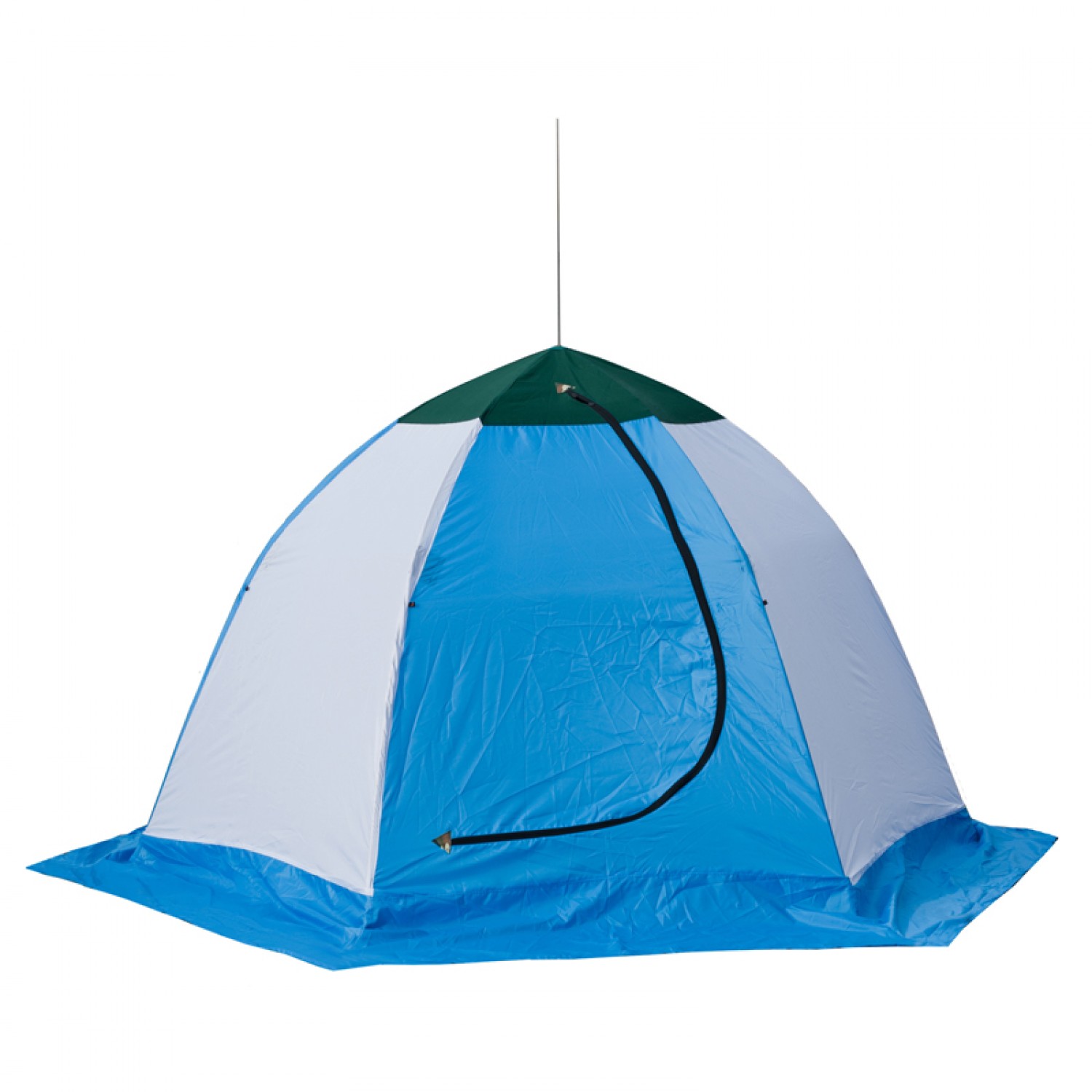 Основная часть тента изготовлена из синтетической водостойкой ткани 210 Neylon Oxford. Палатка сделана целиком из синтетики, что предпочтительнее в сырую погоду - ткань не намокает и не начинает пропускать воду. Крепление зимней рыболовной палатки ко льду производится растяжками от дуг каркаса. Палатки для зимней рыбалки оснащены «юбкой», устраняющей продувание по низу. Вход в палатку закрывается мощной молнией тип 10. На внутренней поверхности тента есть карманы для различных мелочей.