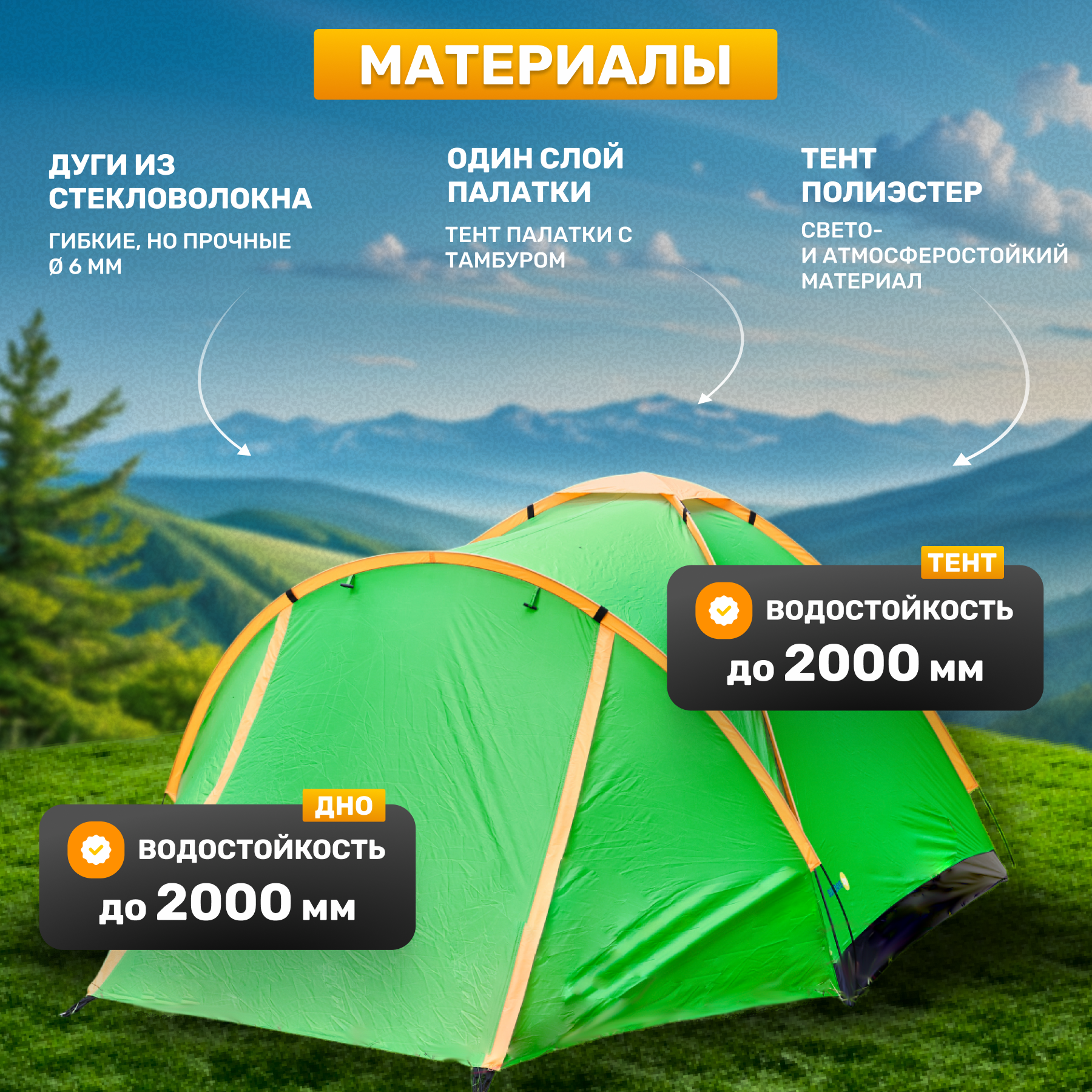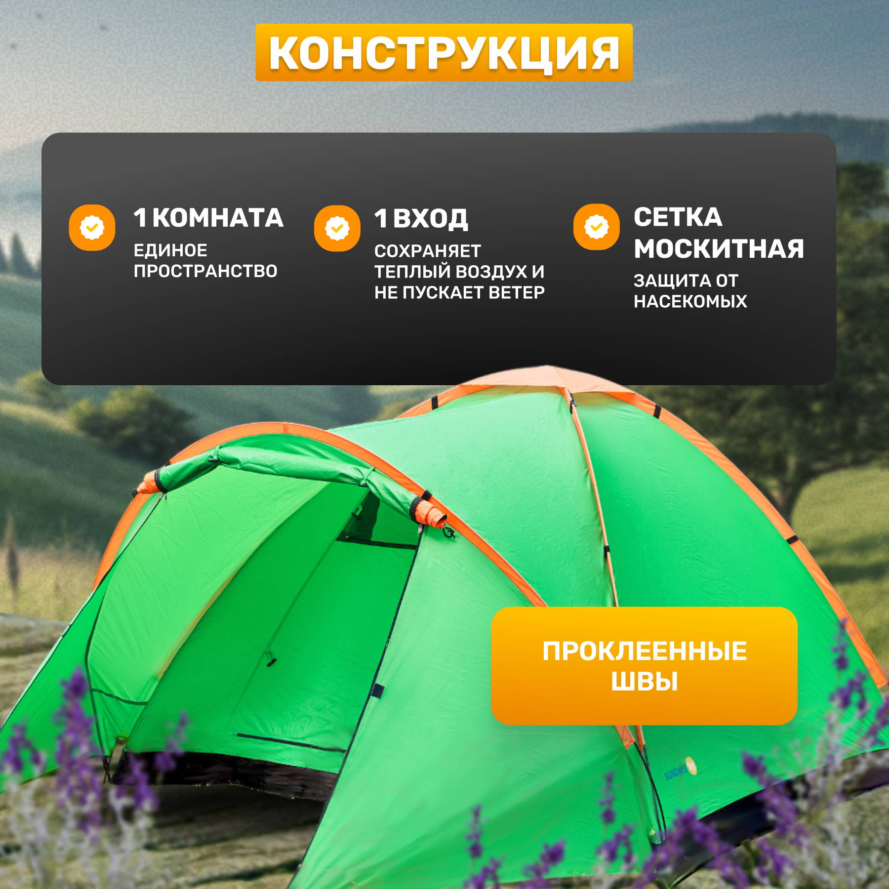 - Универсальность: яркий оранжево-зеленый цвет делает палатку заметной, а проклеенные швы гарантируют дополнительную защиту.