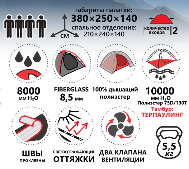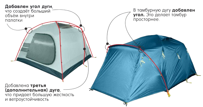 - Два входа и просторные тамбуры: обеспечивают удобный доступ и возможность хранения снаряжения.