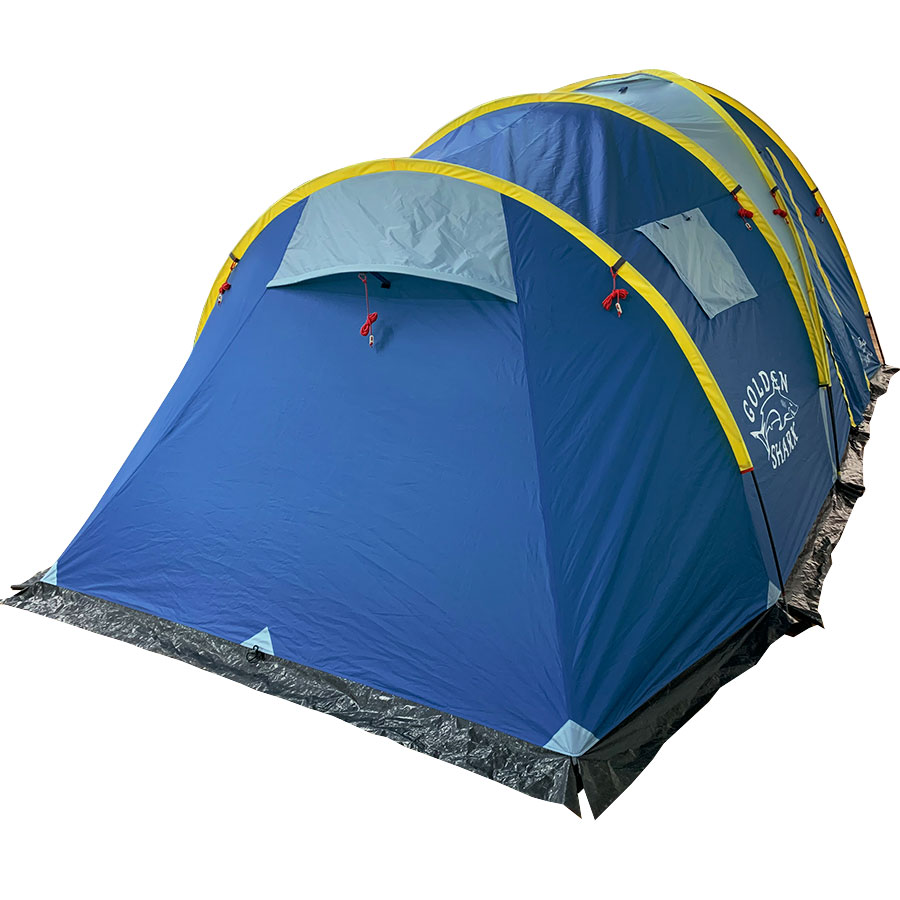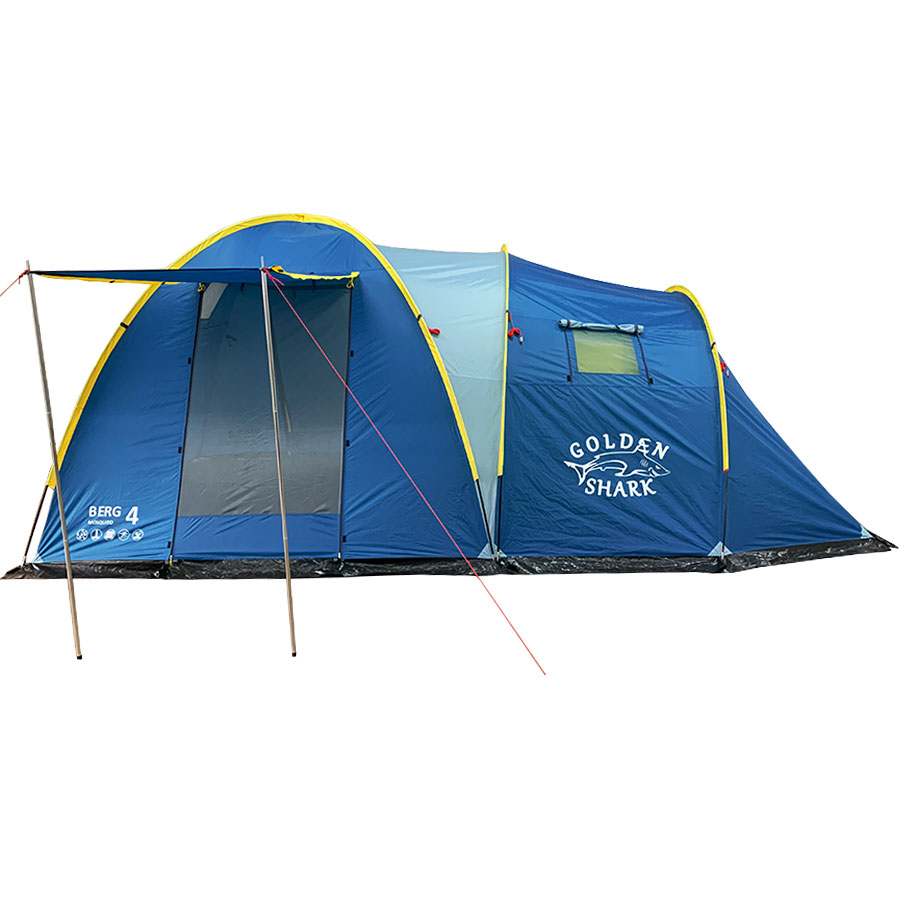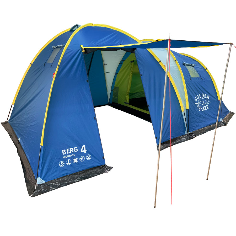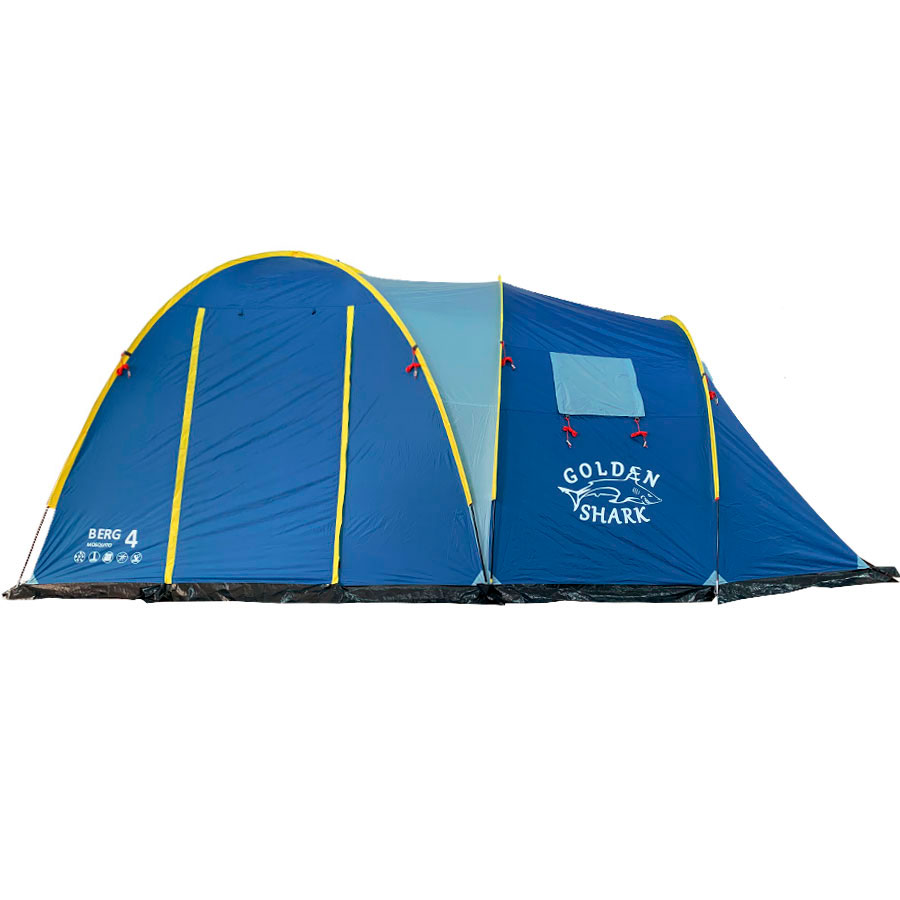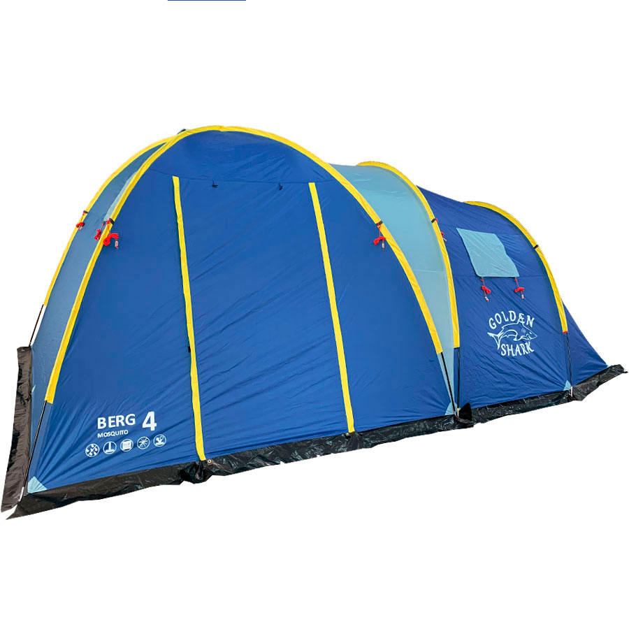 Палатка GOLDEN SHARK Berg Mosquito 4 - Высокая и просторная палатка с навесом. Большой тамбур позволит разместить Ваши вещи, стол и стулья. Дополнительный вход и наличие окон обеспечивают качественную вентиляцию. Специальная "юбка" дополнительно защитит от ветра, влаги и насекомых. Входы в тамбур и окна продублированы противомоскитными сетками. Прочная на разрыв, усиленная ткань 210T RipStop с защитой от УФ-излучения.