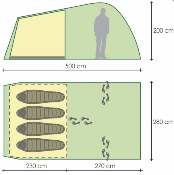 Современная конструкция позволяет в первую очередь установить верхний тент, что сохраняет спальное место сухим даже при сборке в сильный дождь. В данной модели можно убрать спальное место и превратить палатку в шатер или кухню.