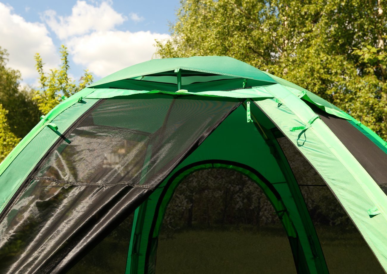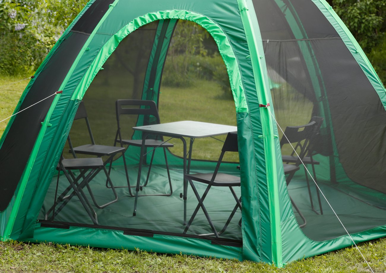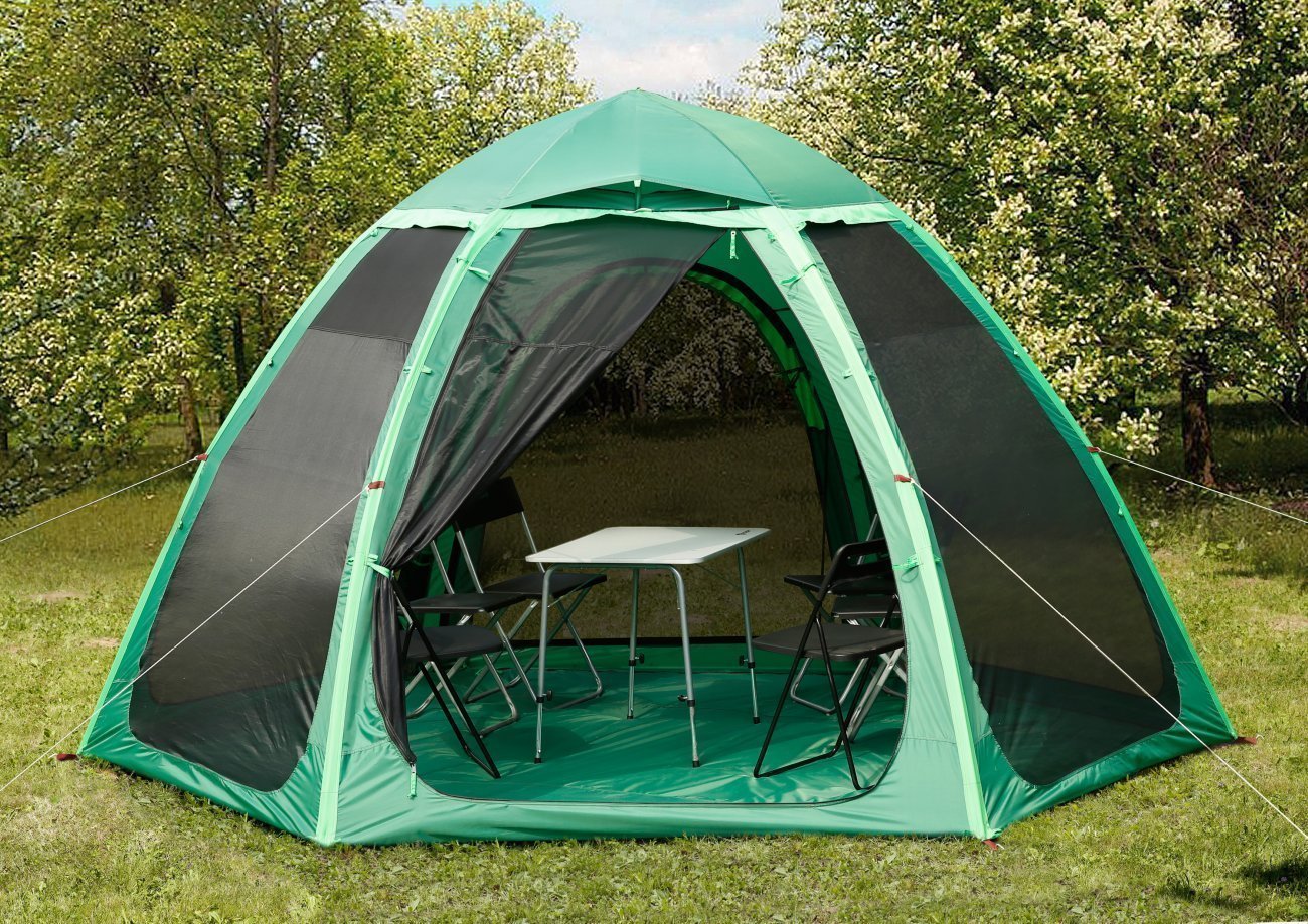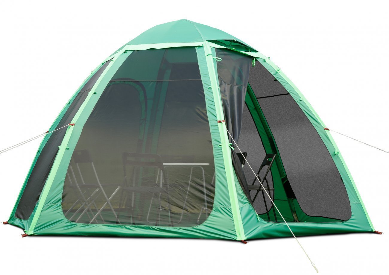 Трехметровый диаметр и двухметровая высота позволяют свободно разместить под куполом палатки стол со стульями на 6 персон. Проветриваемая со всех сторон конструкция и возможность создания теневой защиты с солнечной стороны позволяют применять палатку в качестве шатра в летнее время года для быстрой организации комфортного пикника на природе.