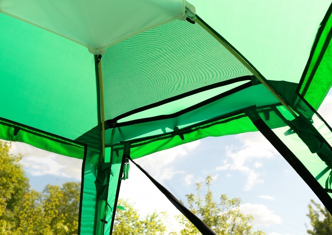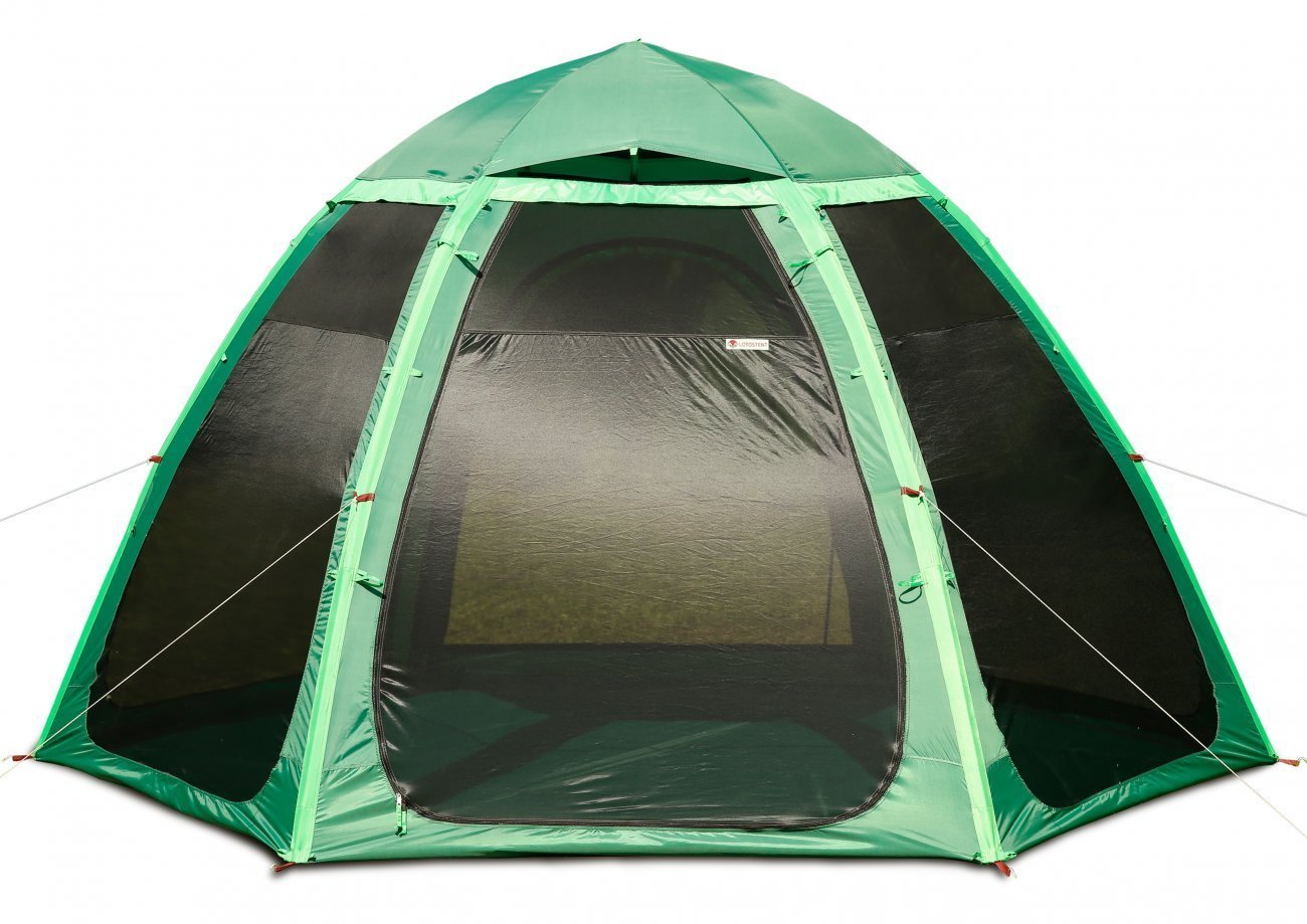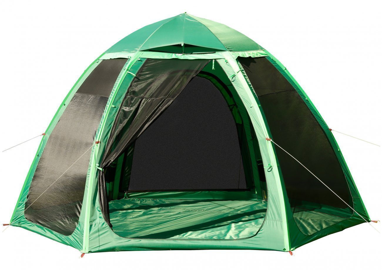 Летняя палатка «ЛОТОС 5 Опен Эйр» имеет устойчивую шестигранную конструкцию, где все стенки выполнены из прочной противомоскитной сетки.