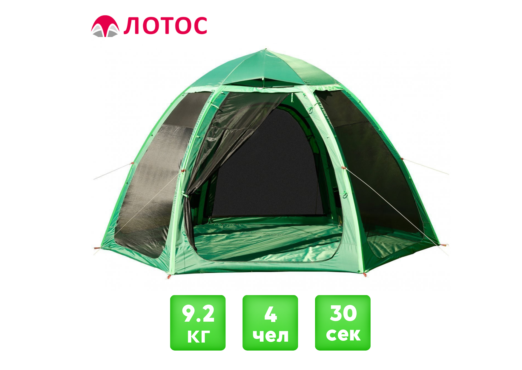Если Вы любитель комфортного и рационального отдыха на природе, то Вам стоит купить палатку ЛОТОС 5 Опен Эйр! Большой летний шатер, выполненный в виде герметичной капсулы, легко трансформируется в межсезонную палатку при помощи дополнительных опций. Легкая автоматическая конструкция удобна для использования в качестве садового шатра или шатра для дачи, когда необходимо быстро организовать герметичное и хорошо проветриваемое укрытие.