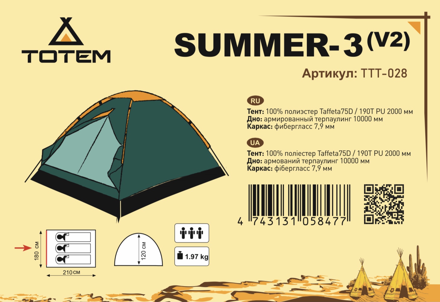 Палатка TOTEM Summer 3 V2 - это универсальная недорогая палатка для туристических походов в весеннее, летнее и осеннее время. Палатка однослойная, все швы палатки проклеены. Дно палатки из арммированного полиэтилена (терпаулинг).Палатка имеет вентиляционный клапан, вход в спальное отделение продублирован москитной сеткой.