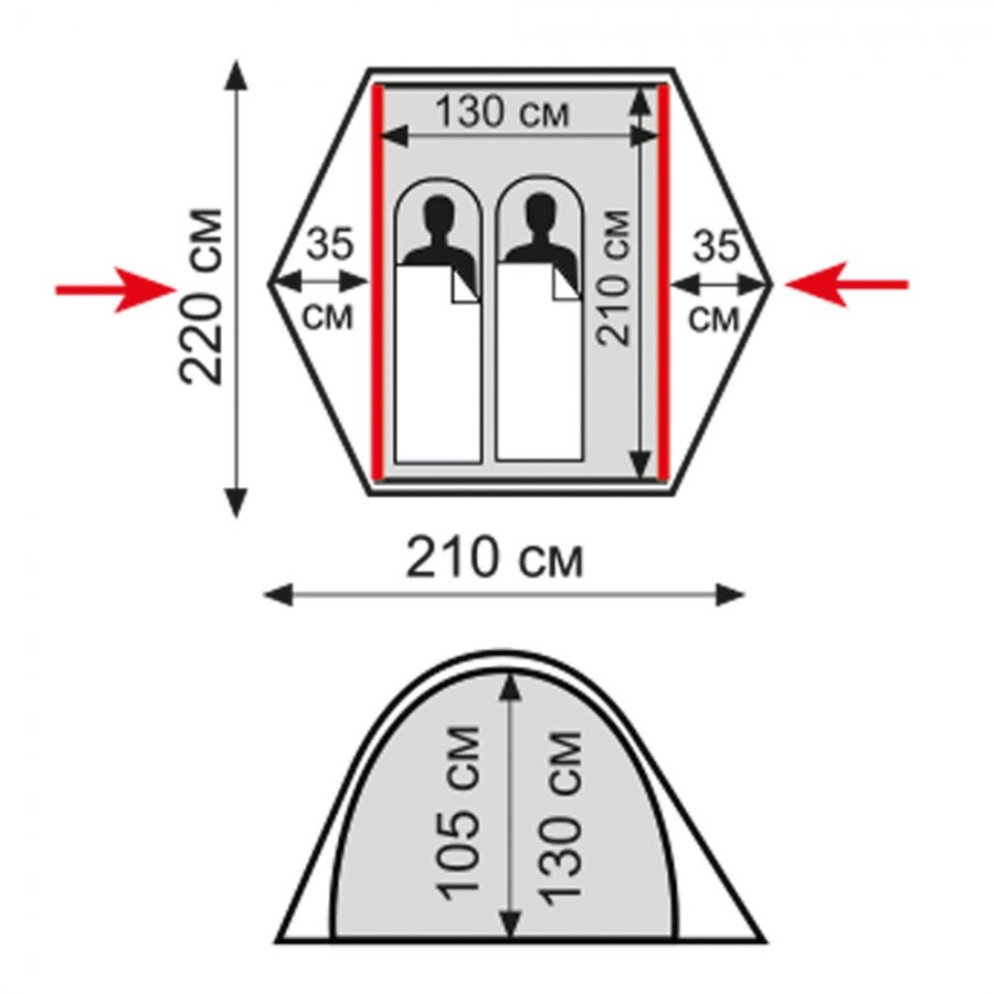- Размер внутренней палатки ДхШхВ, см 130 х 210 х 105