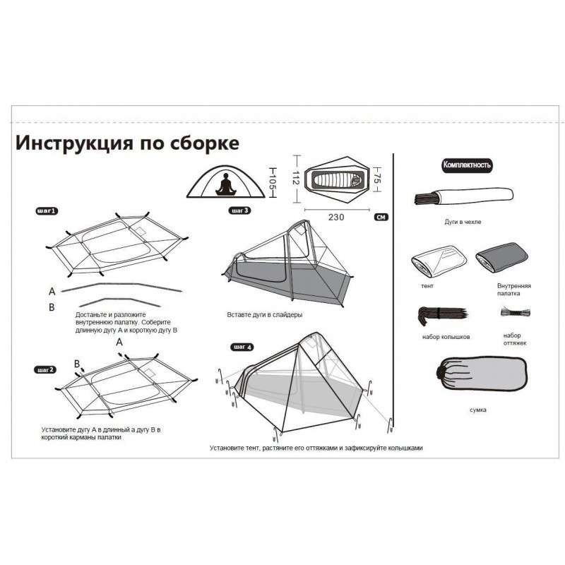 Сверхлегкая одноместная туристическая палатка Tramp Air 1 Si мечта каждого туриста легкохода вес1,25кг.и занимает минимум места в рюкзаке. Это модель специально разработана специально для соло-путешественников, которые ищут качественную и надежную палатку по доступной цене.Палатка клиновидной формы с двумя входами и одним тамбуром. Простая тунельная конструкция с двумя дугами делает установку палатки быстрой и легкой и.Благодаря низкому и наклонному профилю эта модель может похвалится прекрасной ветроустойчивостью.В отличии от некоторых одноместных палаток в Tramp Air 1 очень удобно находиться не только лежа - но и сидя или полу лежа читать, готовить еду собирать рюкзак, переодеваться , именно благодаря тунельной конструкции, высоте , удачному расположению и арочной форме основной дуги.Внутренняя палатка практически полностью выполнена из сетки благодаря чему палатка прекрасно вентелируеться , в ней практически не скапливается конденсат, и в ней вам будет комфортно даже жаркой летней ночью.Палатка пошита из прочного, усиленного Rip-Stop плетением и пропитанного силиконом нейлона с высокой водонепроницаемостью.Благодаря светло серому цвету тент будет значительно меньше выгорать на солнце , и дольше прослужит если вы в основном путешествете летом и в жарких странахНазначение: пешие и горные походы, fast&light туризм, вело походы и мото-поездки, путешествия автостопом или low cost перелетами , рыбалка, охота и налегке, отдых у моря.Время использования :весна лето осеньОсобенности:- ультралегкая- силиконизированная ткань нейлон Rip-Stop- конструкция HUB с консолью- двухслойная с 2 входами и 1 тамбурам для хранения снаряжения или приготовления еды- все швы проклеены- два вентиляционных клапана- внешний тент имеет пропитку задерживающую распространение огня- светоотражающие оттяжки и элементы на вентиляции- у комплектована 3-х гранными колышками яркого цвета- при необходтимости к палатке можно докупить дополнительный пол (Footprint) для большей защиты дна палаткиХарактеристики :Вместимость : 1 человекЧистый вес (без колышков и ветровых оттяжек):1250 г.Вес : 1,25 кг.Конструкция : клиновидный тунельВходы и тамбура : 2 входа и 1 тамбурКаркас: авиационный алюминий 7071 8,5 ммТент : 4000 мм. в.ст. 100% нейлон 15D nylone coated siliconeДно: 4000 мм. в.ст. 100% нейлон 15D nylone coated siliconeЦвет: светло- серыйВнутренняя .палатка: дышащий полиестерРазмер: 75/112*230*105 смГабариты в упаковке: 37*15*13 см
