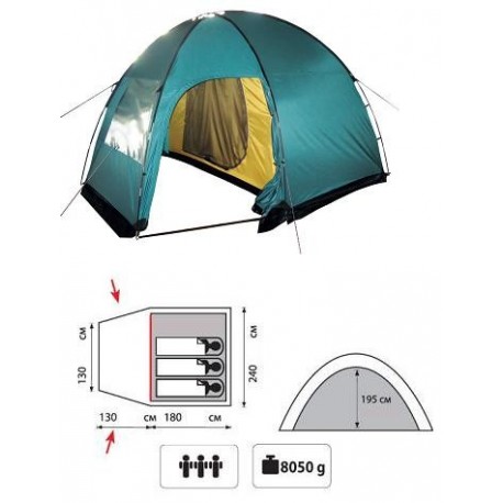 Двухслойная кемпинговая палатка предназначена для путешествий в весенне-осенний и летний период. Размеры позволяют максимально комфортно разместится трем людям. Внушительные размеры тамбура могут быть использованы для размещения всех участников экспедиции.