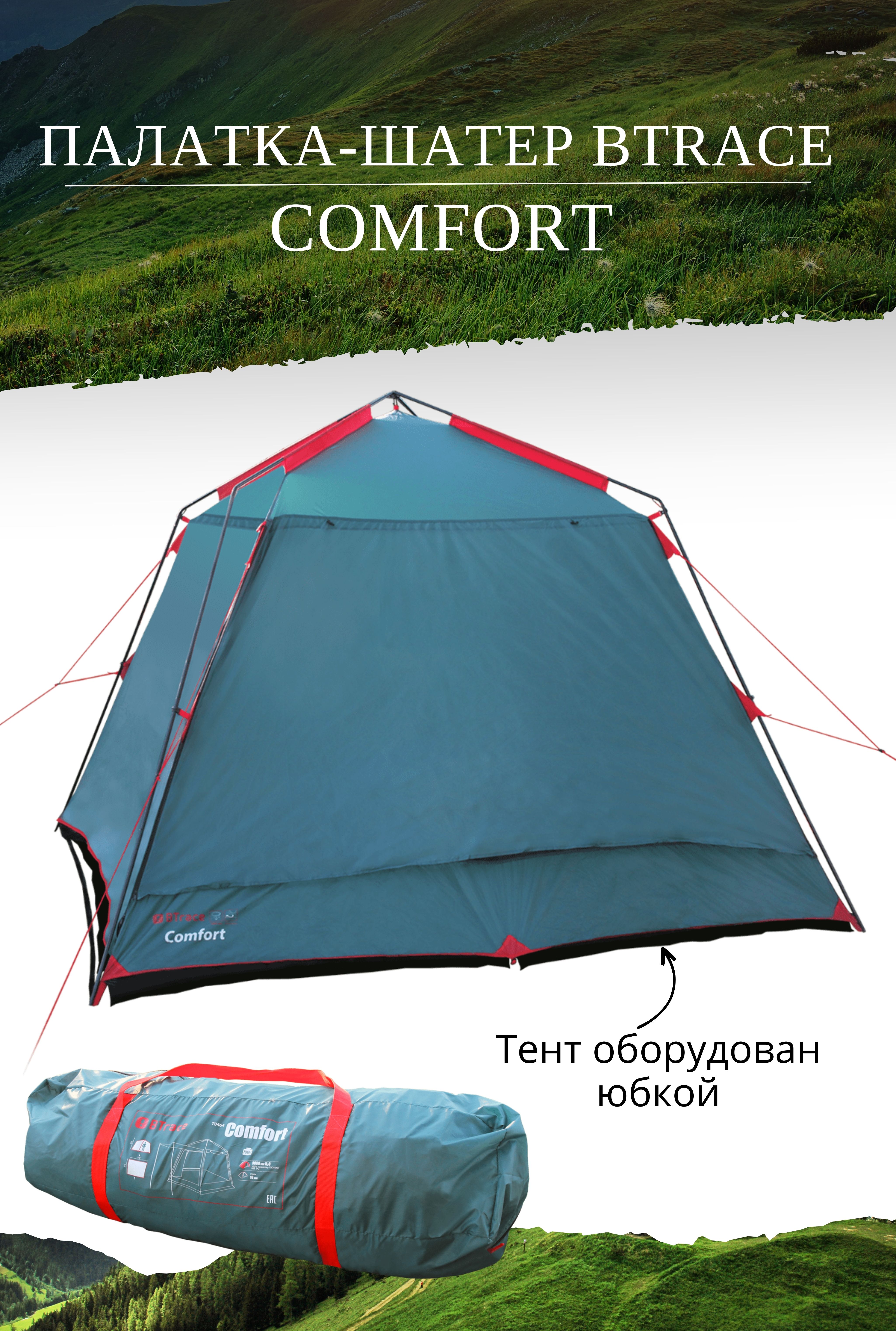 Палатка-шатер BTrace Comfort Green обеспечивает комфортные условия для длительного времяпрепровождения на природе.