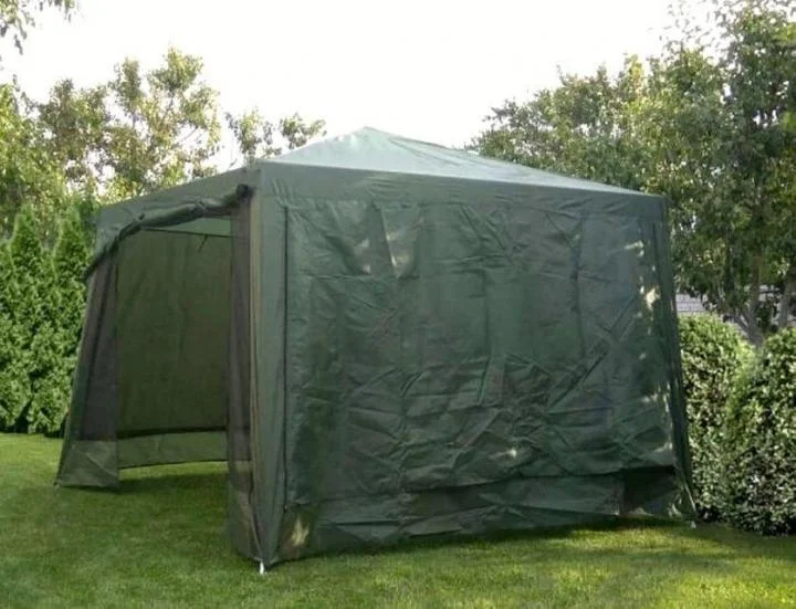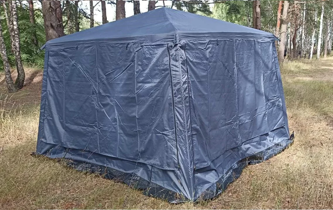 - Тент шатра выполнен из полиэстеровой ткани (Polyester 190T). Ткань тента обладает водонепроницаемостью 3000 мм, но ШВЫ НЕ ПРОКЛЕЕНЫ (при сильном дожде по швам может потечь вода).