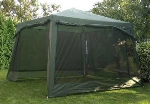 Модель этой палатки-шатра создана для двух направлений и ее конструкция позволит не только комфортно переночевать или отдохнуть на природе, но и расположить внутри палатки небольшую походную кухню или туристический стол со стульями. Туристическая палатка-шатер имеет классическую форму, четырехскатную коническую крышу и весьма хорошую высоту - 245 см, из-за чего даже самым высоким людям не придется нагибаться внутри палатки. Боковые стенки имеют москитные сетки, которые защищают от насекомых и хорошо пропускают солнечный свет. При наступлении ночи боковые стенки закрываются шторками.