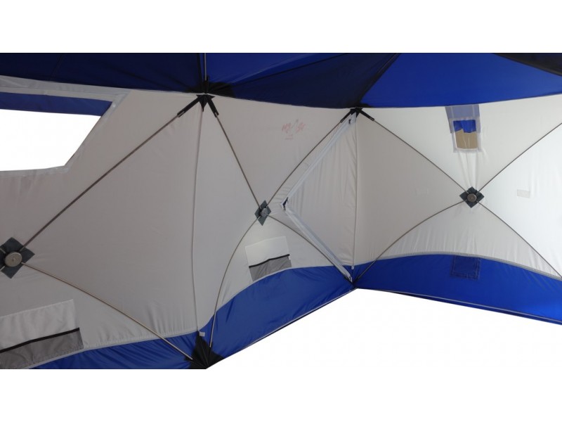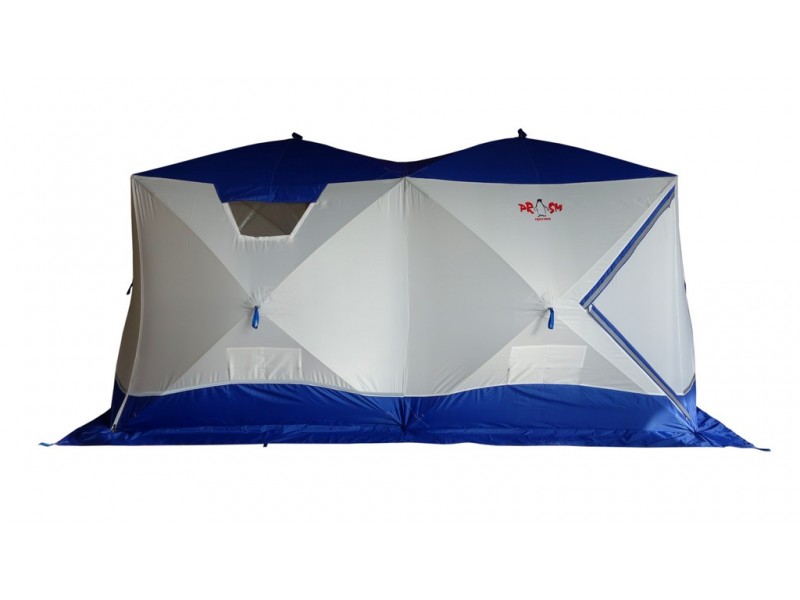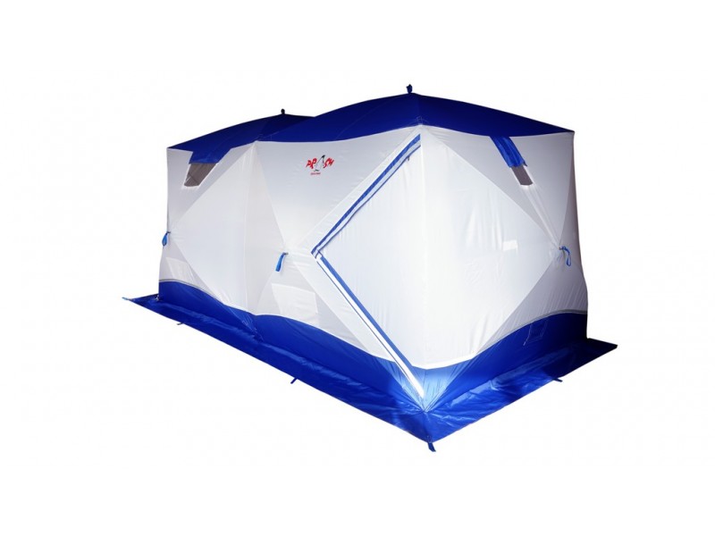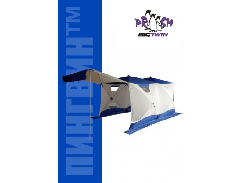 Имеет форму двойного куба, что позволяет организовать базовый лагерь от 4-х человек и при этом рационально использовать пространство. "Big Twin" - это не только укрытие для рыбаков. Благодаря конструкции "Шелтерс", одна из сторон поднимается и становится крышей, тем самым модифицируя палатку в шатер. Летом, установив палатку на берегу водоема, вы находитесь в укрытии и в то же время имеете открытый доступ к воде и абсолютно свободно работаете со снастями. В то же время вещи, прикормка, насадка, снасти - всё находится рядом в укрытии. Размеры "Big Twin" позволяют комфортно расположить вещи и с удобством разместиться самим. Зимой сверлить лунки можно непосредственно в установленной палатке. Несмотря на свои размеры, палатка выдерживает порывистый ветер. Легко ставится в любую погоду. Для удобства в палатке также сделано два входа. Входы сделаны напротив друг друга, что позволяет оптимизировать внутреннее пространство (при этом открывающая сторона находится напротив дверей). Входы с фиксатором – липучкой выполнены в угловом варианте и снабжены специальной зимней молнией, которая снаружи имеет защитную планку, предотвращающую от замерзания. На наружной юбке имеются оттяжки для крепления порогов при отсутствии снега. Тент кроме поднимающейся стороны и двух входов имеет: 3 форточки, выполненных из прозрачной морозостойкой ПВХ-плёнки (одна полностью съёмная), 4 настрочных кармана с сеткой, 4 потолочных кармана-сетки, выход под трубу на липе. Основной цвет белый с цветной крышей и порогами. Снаружи имеются светоотражающие элементы, что очень важно для безопасности на льду в темное время суток.
