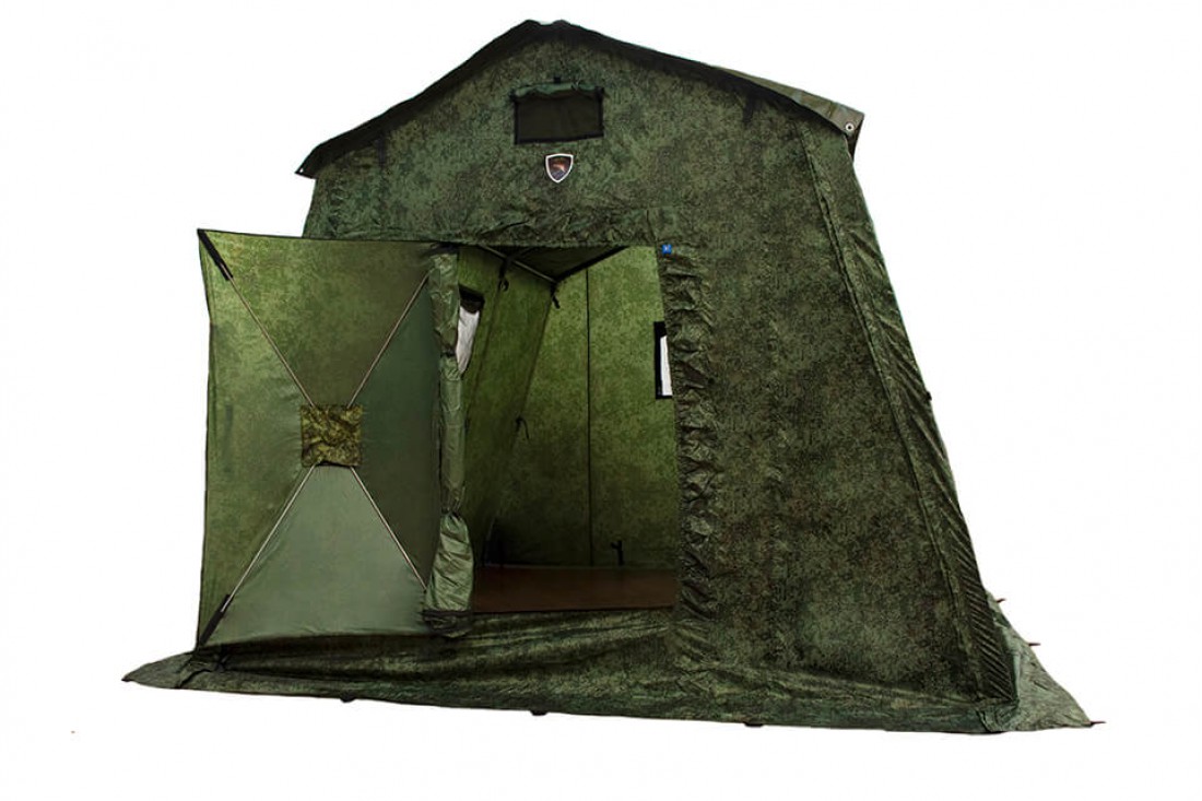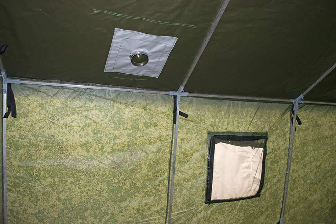 Армейская палатка на 4 человека 4М1 комплектуется многослойными окнами, дымоходом для установки печи и съемной распашной дверью.