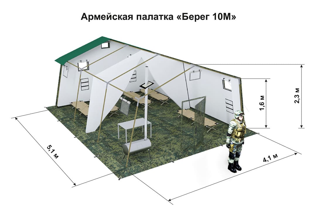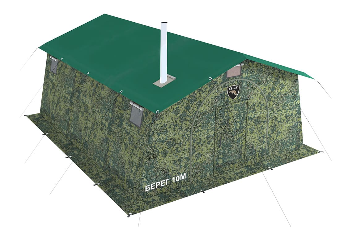 Армейская палатка на 10 человек Берег 10М1 — каркасная однослойная палатка с двускатной крышей для использования в весенне-летний период. Комфортная температура эксплуатации до +10 градусов. Палатка предназначена для размещения в походных условиях группы до 10 человек, организации лагеря, полевой кухни или медицинского пункта.
