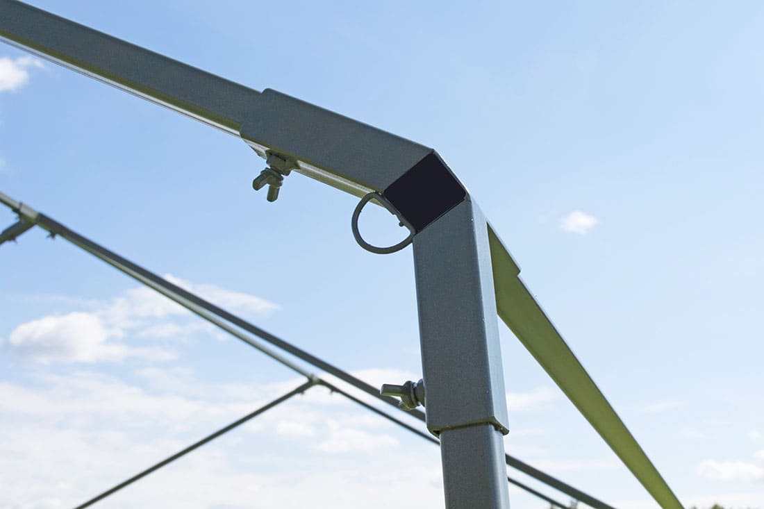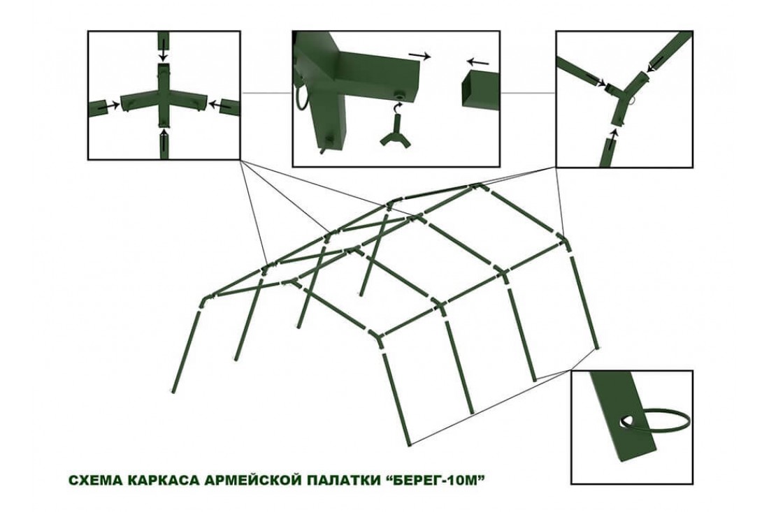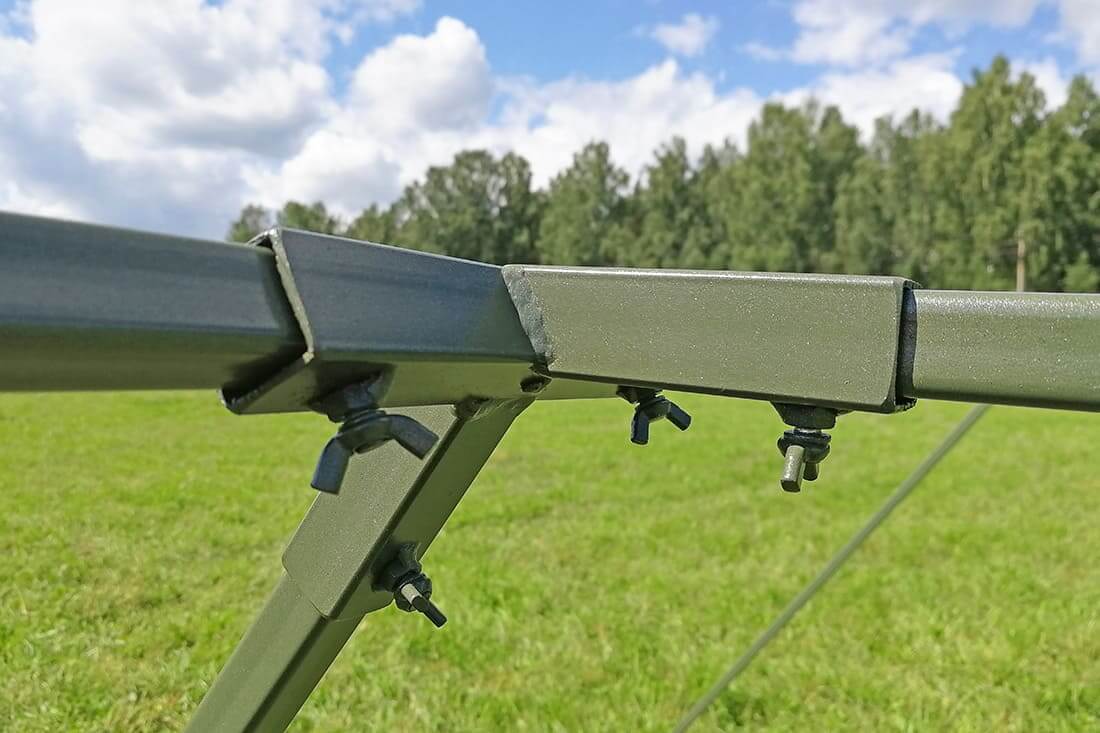 Армейская 10-местная палатка Берег 10М1 выполнена на базе каркаса из равных стальных труб длиной 1750 мм. и сечением 25*25 мм. Равная длина труб упрощает сборку и экономит время, а антикоррозийное покрытие продлевает срок службы каркаса. Равновеликие трубы соединяются между собой с помощью переходников на "барашковом" механизме.