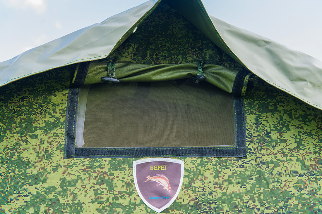 Берег 10М1 комплектуется внешним тентом, стальным каркасом, 6 многослойными окнами с анти москитными сетками и защитными клапанами, двумя входами, дымоходом диаметром 115 мм. для установки походной печи, молнией для установки тамбура.