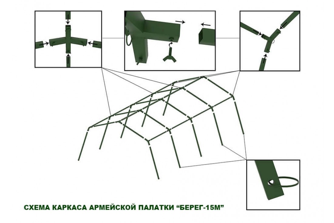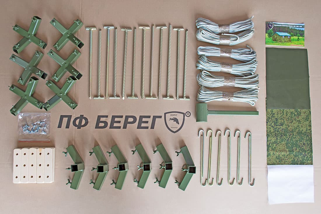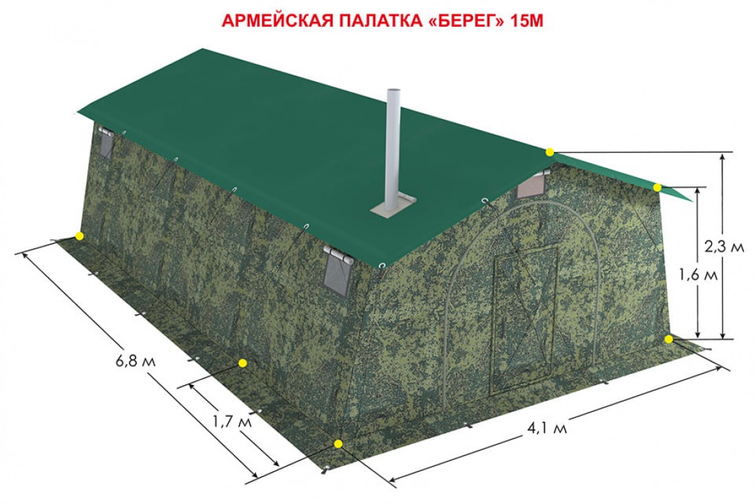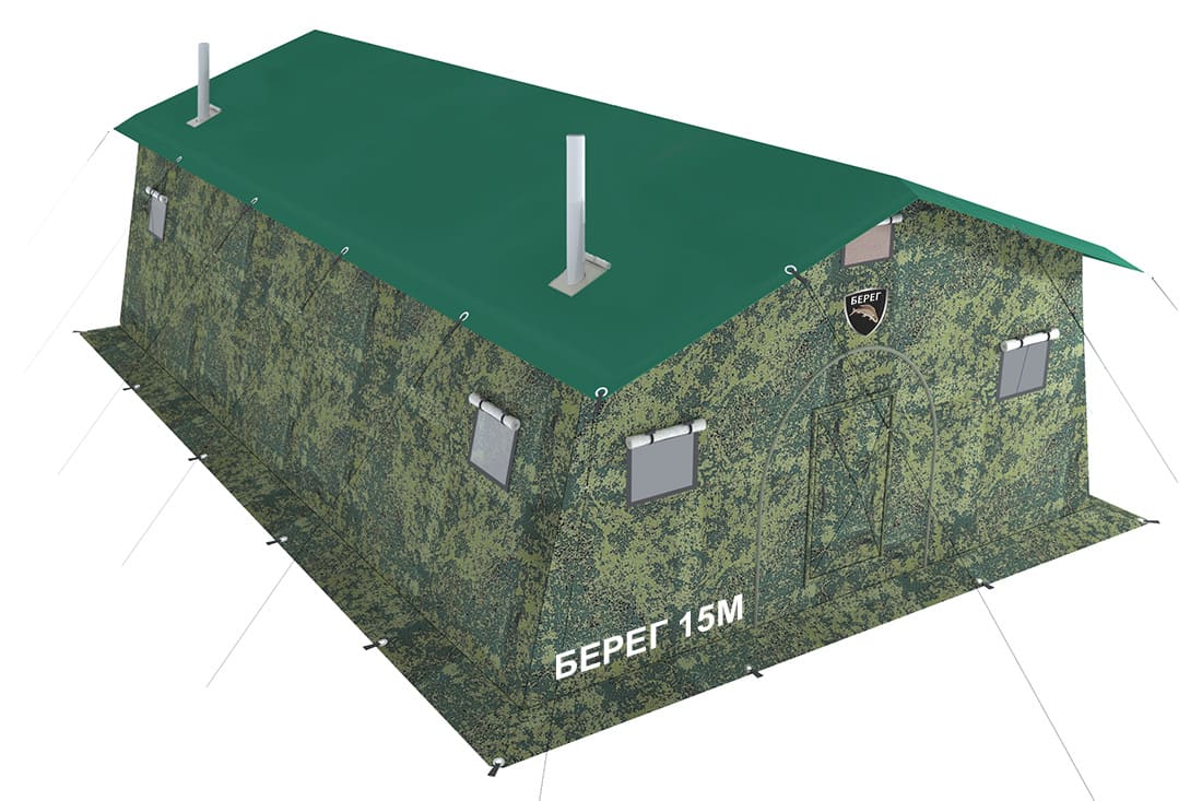 Армейская палатка "Берег 15М1" – пятнадцатиместная каркасная палатка (при размещении на двухъярусных кроватях) с двускатной крышей, окнами из морозостойкого прозрачного ПВХ с москитными сетками и свето-, ветрозащитными шторками, разделкой дымохода, двумя входами, распашной дверью, молнией для крепления тамбура.