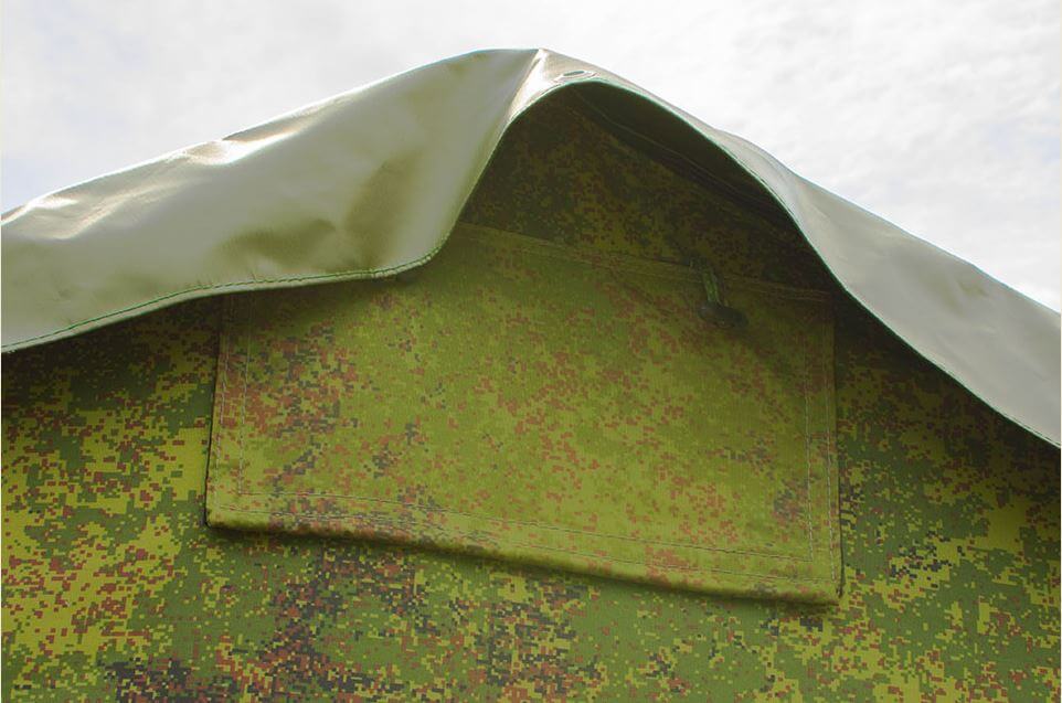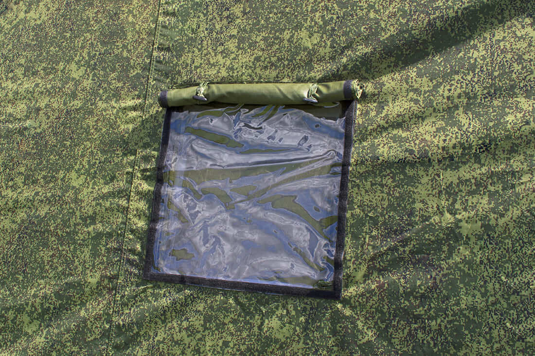 Многофункциональные окна армейской палатки «Берег-15М1» состоят из: защитного клапана со стороны внешнего тента, пластикового прозрачного заполнения из морозостойкой ПВХ ткани, москитной сетки.