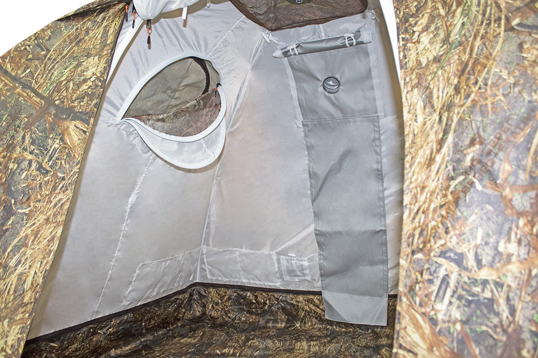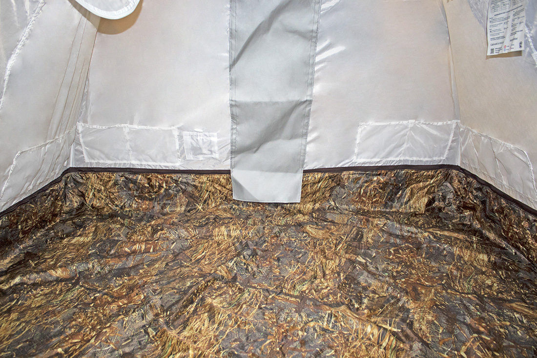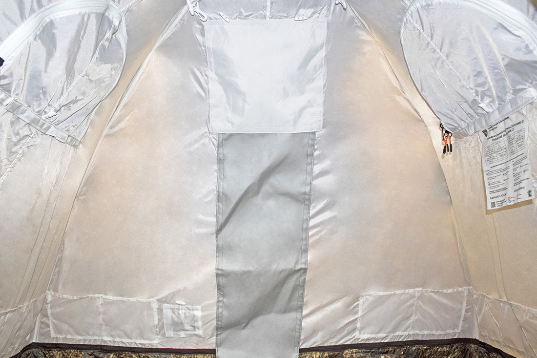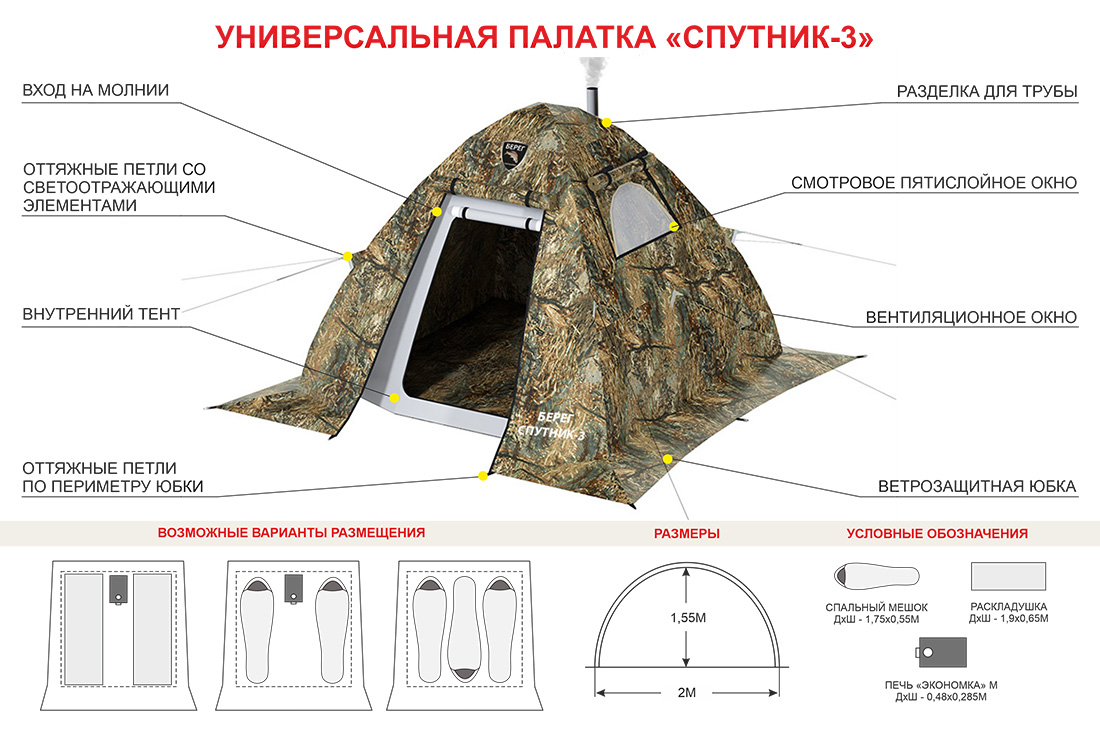 В ее оснащение входит многослойное окно со вставкой из прозрачной морозостойкой силиконовой пленки, разделка дымохода, вход на молнии, москитные сетки на входе и окнах, съемное дно на молнии.