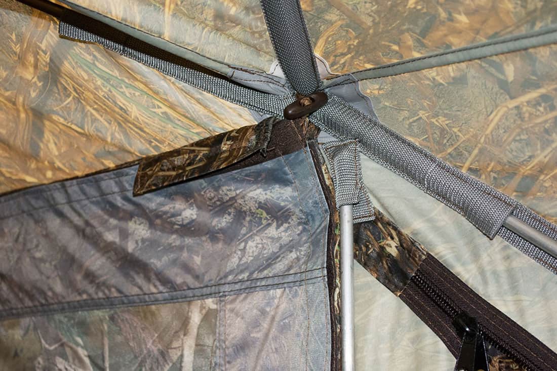 3. К стенке палатки москитная веранда крепится при помощи липы. К опорным стойкам крепление производится на небольшие липы.