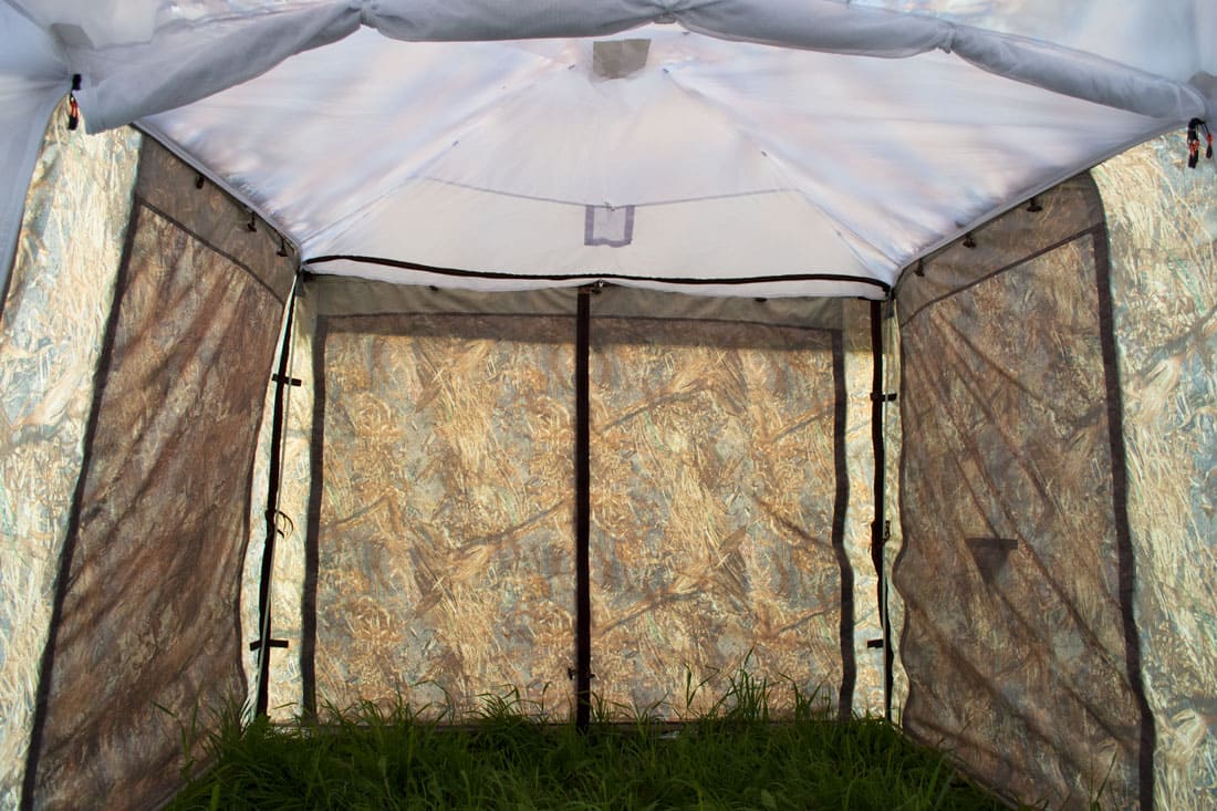 Веранда выполнена из ткани Оксфорд и москитной сетки с мелкой ячейкой, в нижней части имеется широкая юбка с оттяжными петлями для крепления.
