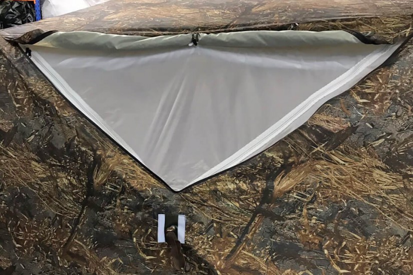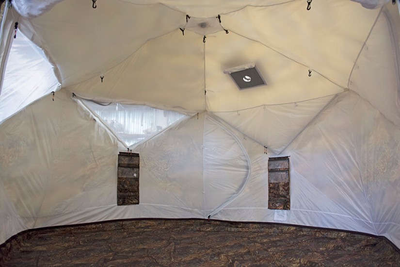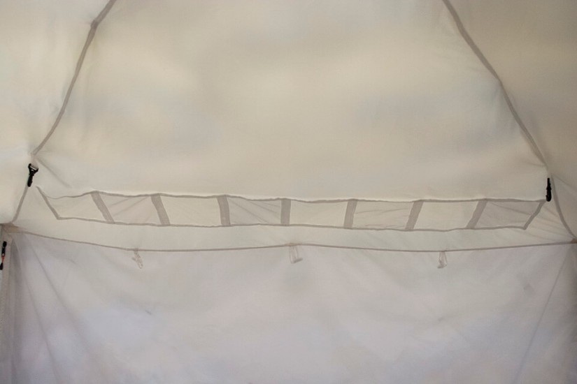 Окна треугольной формы занимают 1/4 часть стены палатки. Окна, как и вход, продублированы внешним и внутренним тентом, а также москитной сеткой.