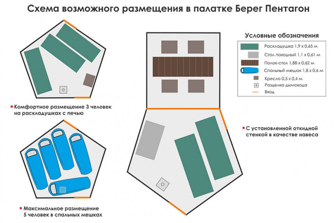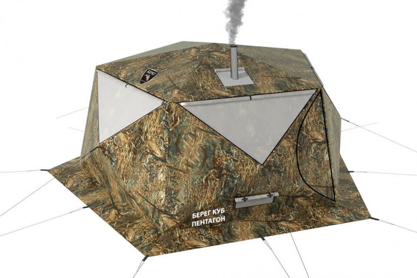 - всесезонная палатка с алюминиевым каркасом и двумя водоотталкивающими тентами. Пентагон выполнен в форме пятиугольника с длиной 1 стенки 2,2 метра. Палатка предназначена для применения в качестве: жилой палатки круглый год, летнего шатра, рыболовной палатки, палатки для охоты.