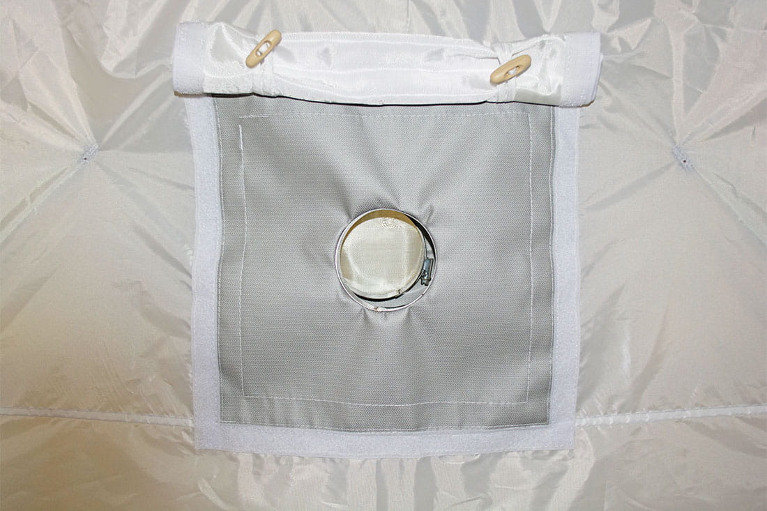 Отверстие дымохода предназначено для установки печи. Представляет собой вставку из огнеупорной термоткани с металлическим кольцом. Изнутри и снаружи закрывается тканевыми клапанами на липе.