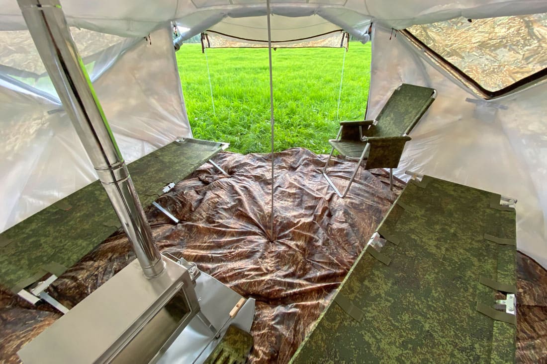 Зимой мы рекомендуем эксплуатировать палатку вместе с теплым полом для палатки Куб «Пентагон» разработанным специально для эксплуатации при экстремально-низких температурах..