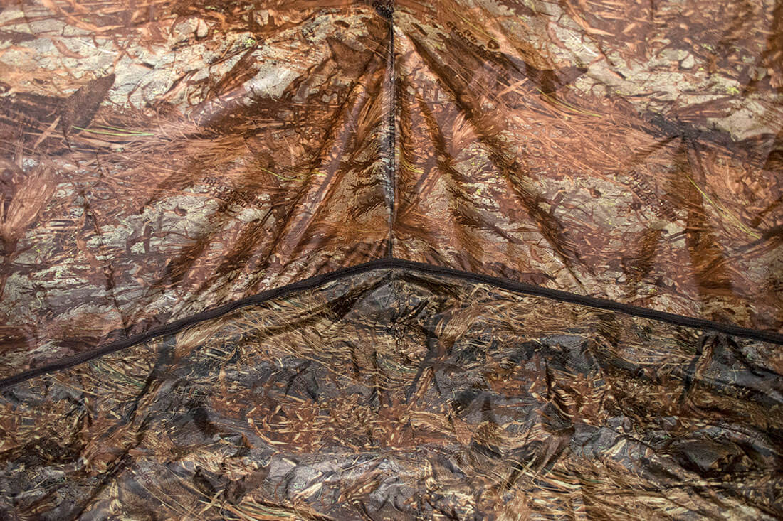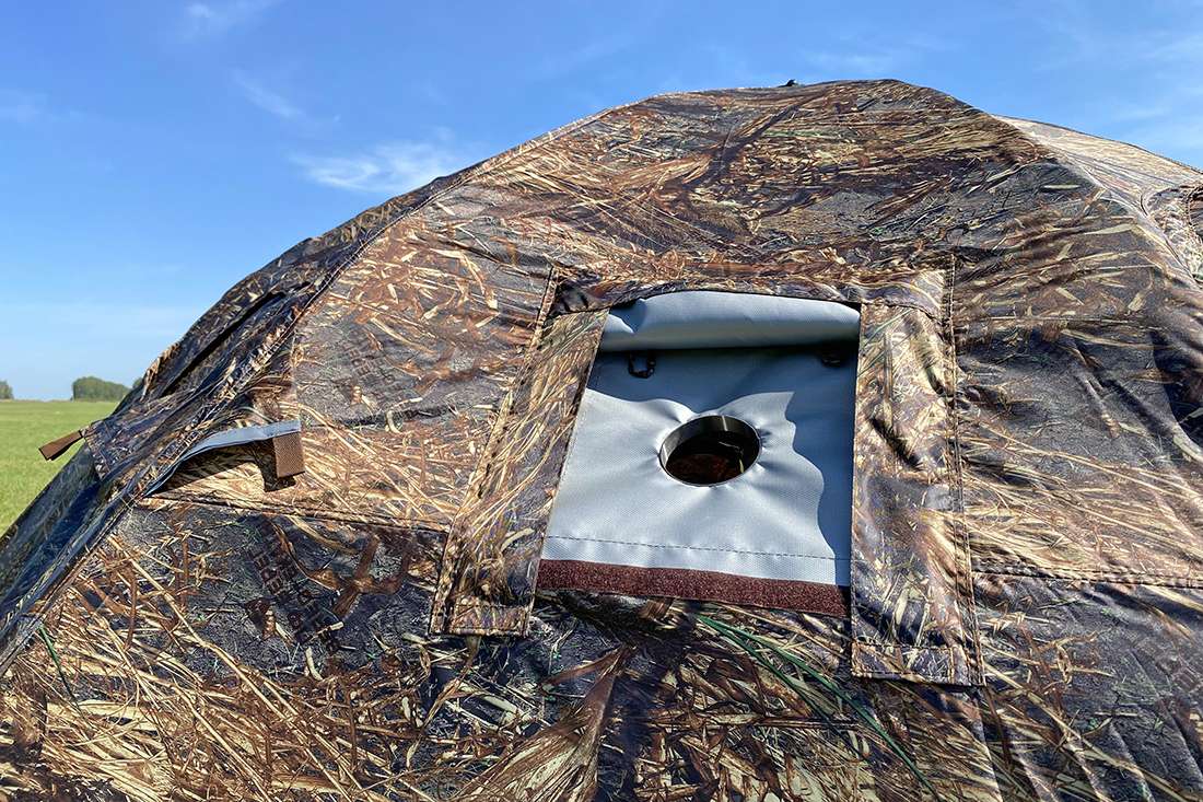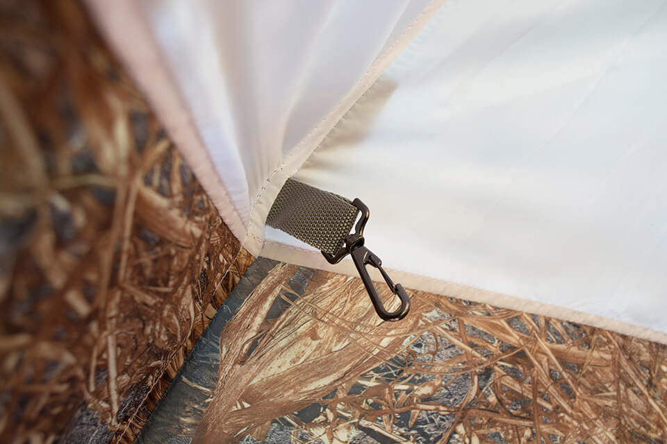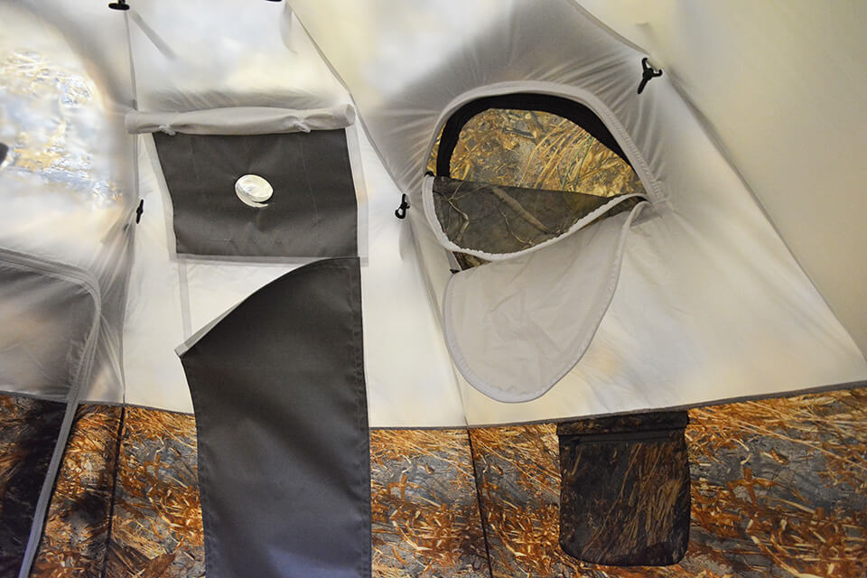 Внутренний тент оборудован съемным полом из ткани Оксфорд на молнии. Он пристегивается на 10 см выше земли, что предотвращает замерзание и попадание осадков и грязи.