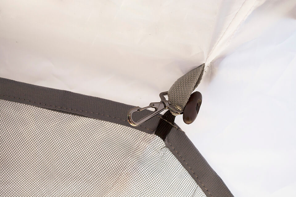 На наружном тенте имеется молния для пристегивания тамбура-соединителя, который поставляется в комплекте с палаткой. Он будет полезен в качестве входной группы и дополнительного пространства для хранения вещей. К тамбуру-соединителю, при помощи лип, крепятся тамбуры-бани (в ассортименте 3 варианта: 2х2, 3х2 и 4х2 м).