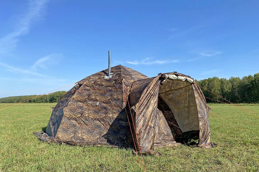 - универсальность (в комплектацию входит разделка дымохода, позволяющая использовать палатку как жилой модуль, баню и т. д.);