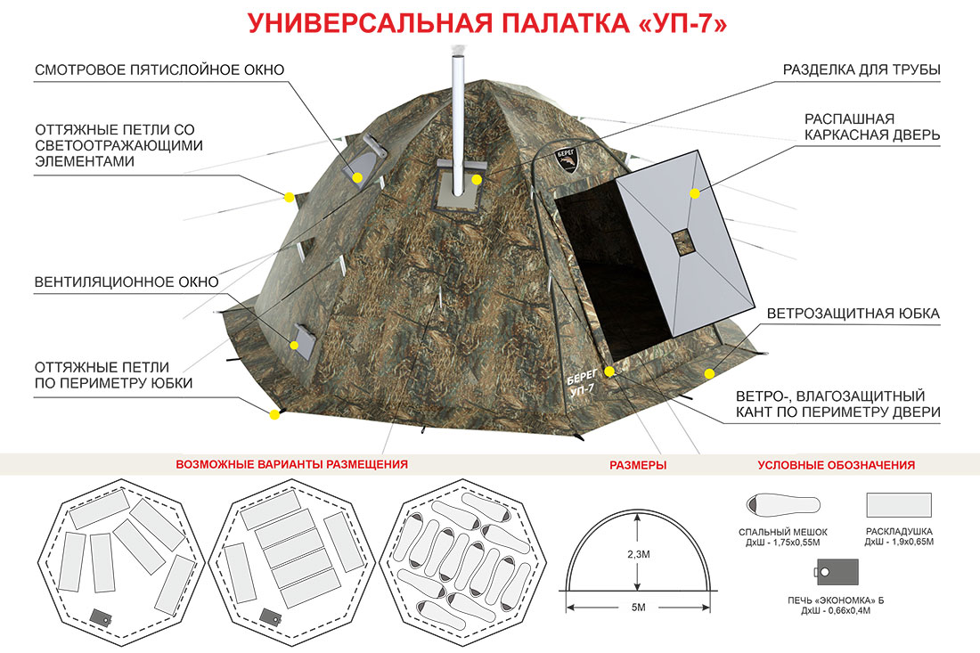 Универсальная палатка Берег УП-7 - двухслойная всесезонная палатка шатрового типа на восьмилучевом алюминиевом каркасе. Палатка УП-7 станет удачным приобретением для любителей рыбалки, охоты и отдыха на природе круглый год.