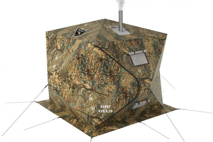 Берег Куб 2.20 – зимняя универсальная палатка для рыбалки, охоты и организации походной бани. Палатка Куб 2.20 оснащена надежным алюминиевым каркасом и плотным внешним тентом из влагоотталкивающего материала. Комплектация палатки включает в себя 2 входа, 2 окна, 2 кармана с отсеками для личных вещей, разделку дымохода 90 мм.