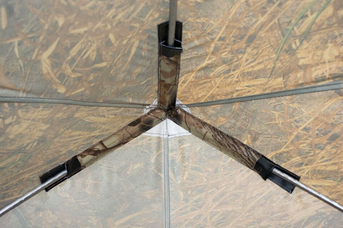 Прутки вставляются в углы со специальной усиленной стропой. В местах расположения механизмов раскрытия («хабов») установлены дополнительные усиливающие ПВХ-вставки.