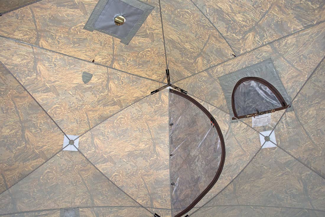 Многослойные окна палатки Куб 2.20 включают в себя москитную сетку и морозостойкое заполнение из прозрачной силиконовой пленки, выдерживающей температуру от +50 до -50 °С.
